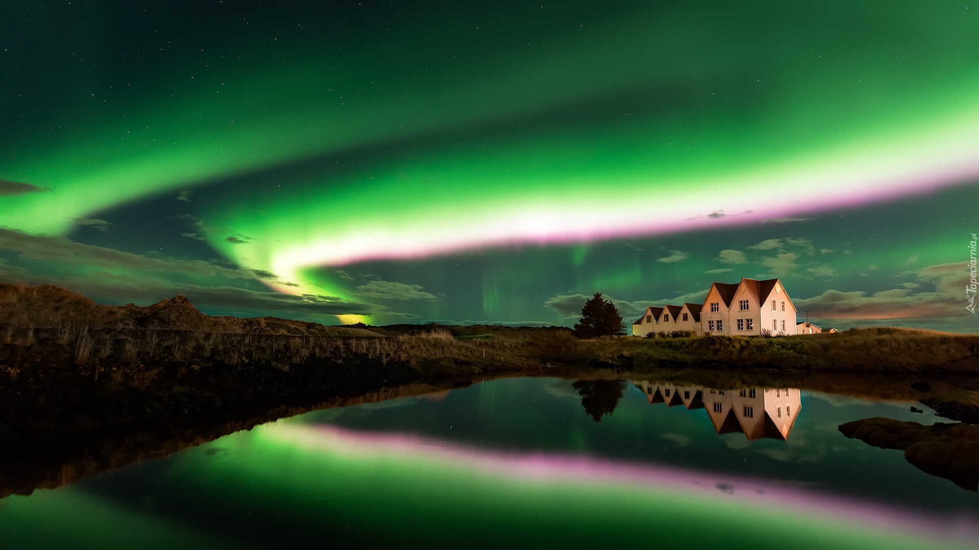 Edytor tapety: Zorza polarna nad domami w Straumur