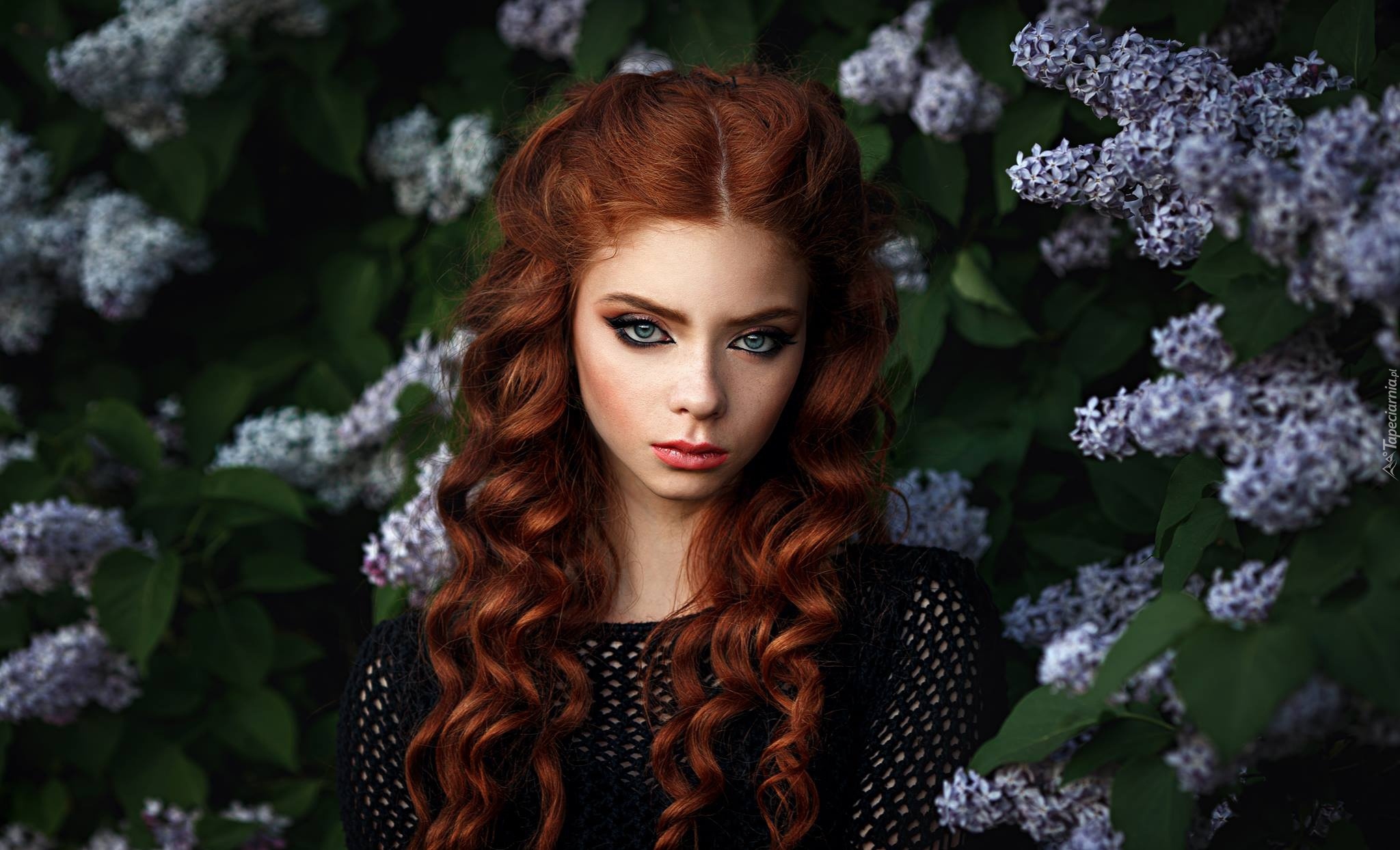 Edytor tapety: Ruda długowłosa kobieta pod krzewem bzu