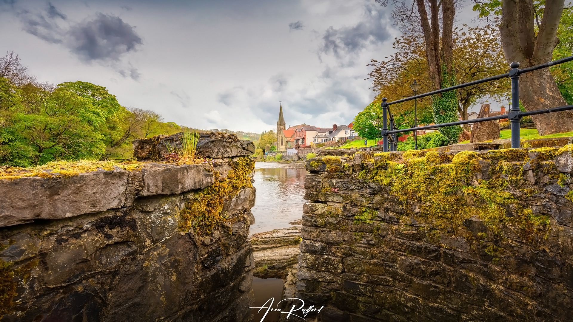 Edytor tapety: Widok zza muru na rzekę i kościół