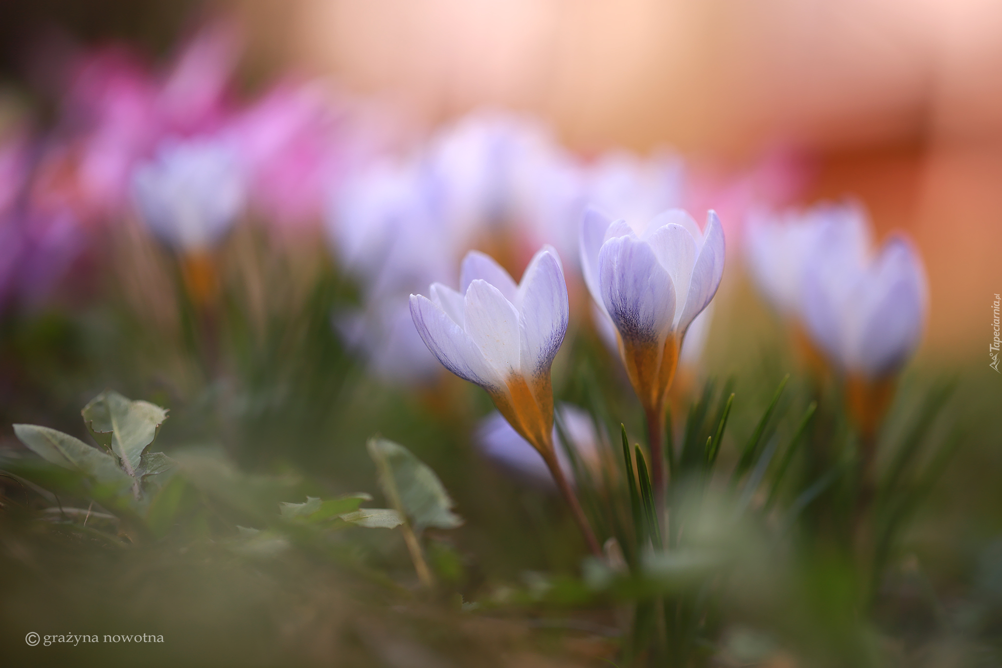 Edytor tapety: Liliowe krokusy w trawie na rozmytym tle