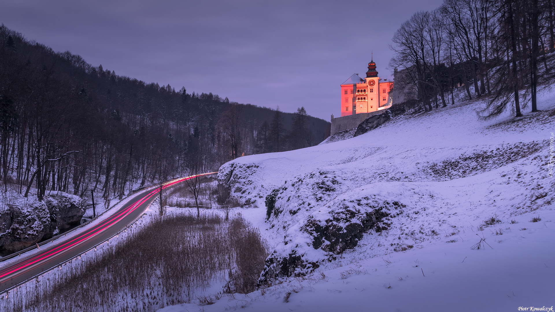 Edytor tapety: Zamek Pieskowa Skała na ośnieżonym wzgórzu