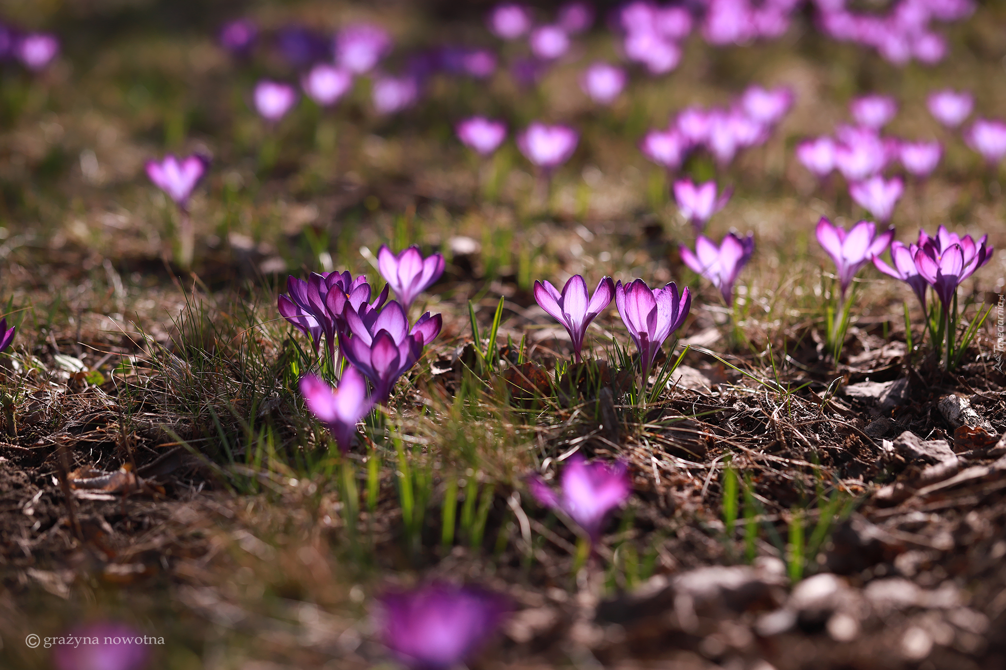 Edytor tapety: Wiosenne rozświetlone krokusy w trawie