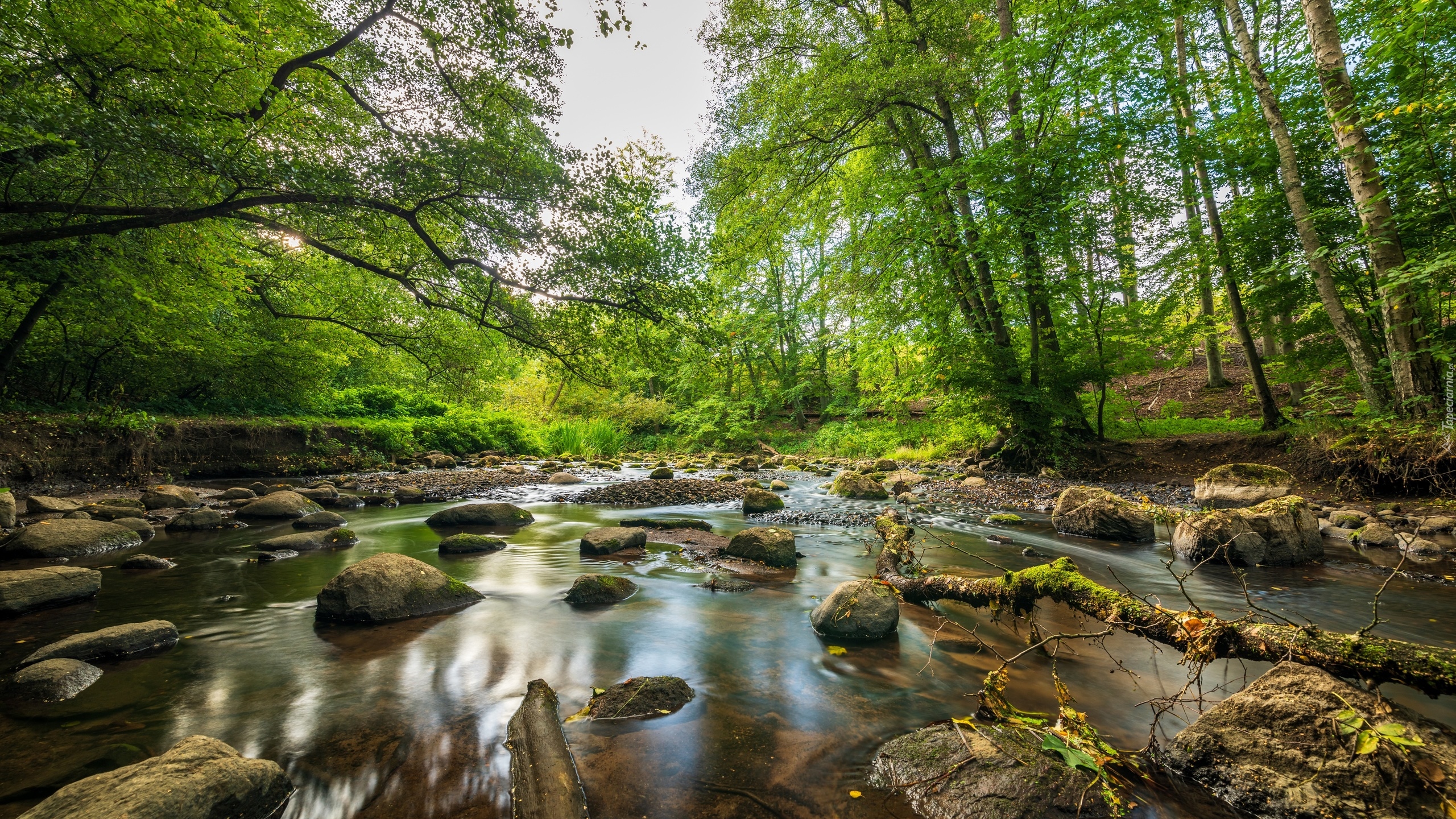 Edytor tapety: Zielony las i kamienie w strumieniu