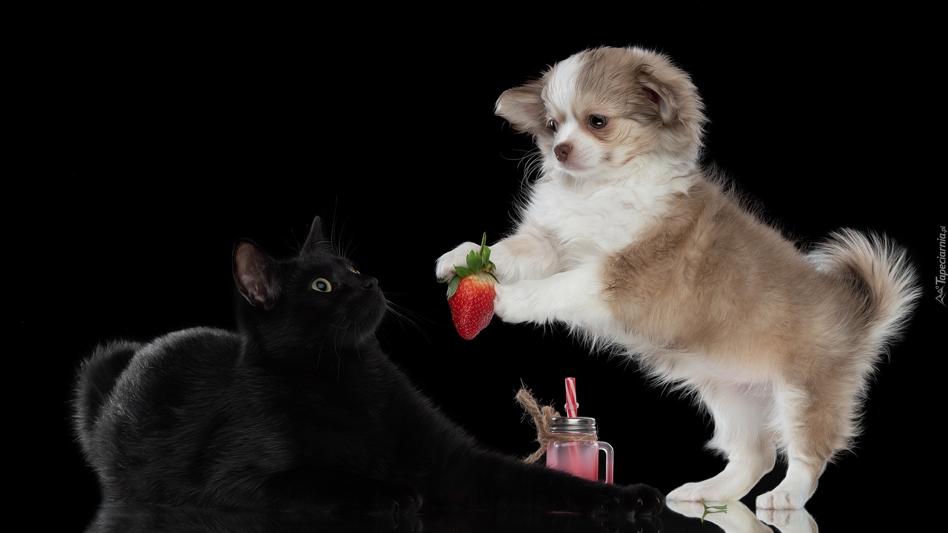 Edytor tapety: Szczeniak z truskawką i czarny kot