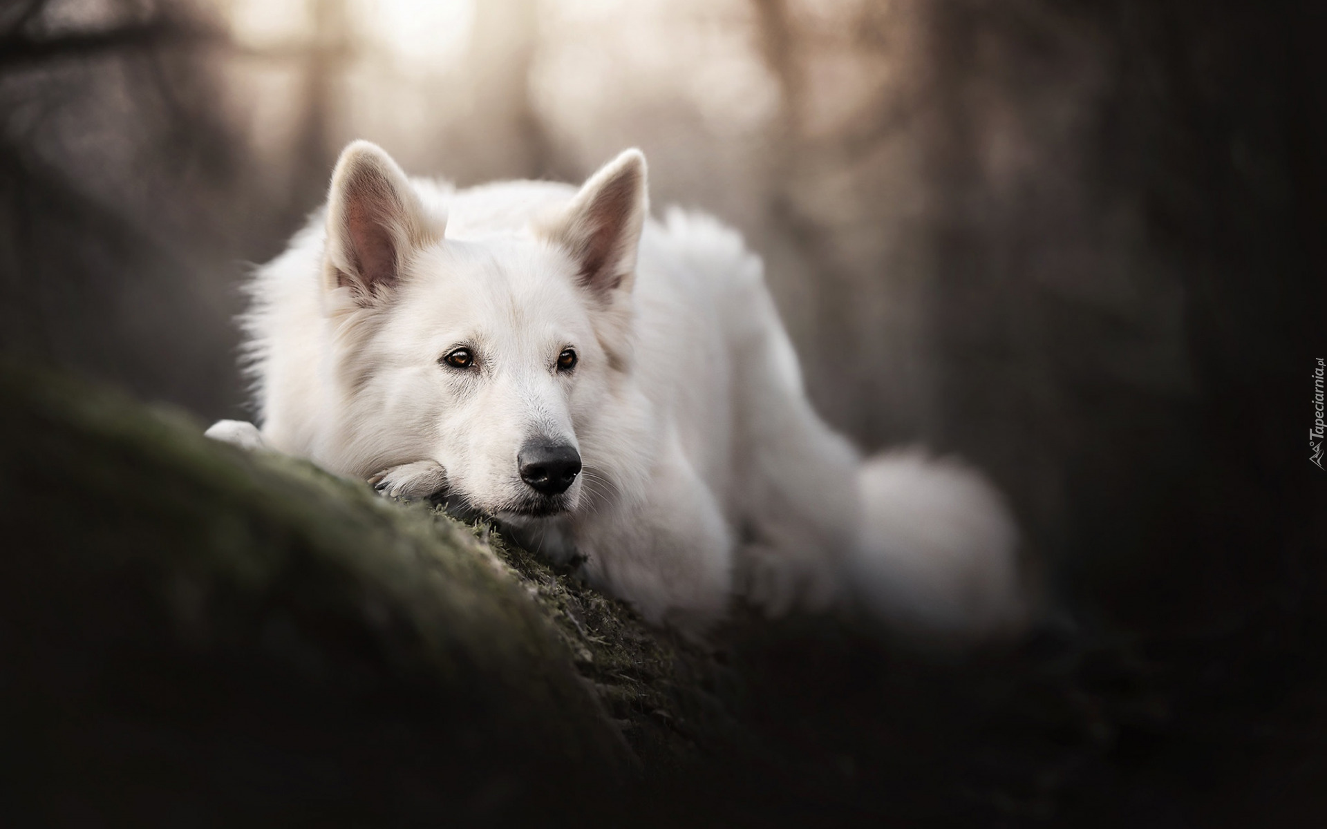 Edytor tapety: Biały owczarek szwajcarski leżący na konarze drzewa