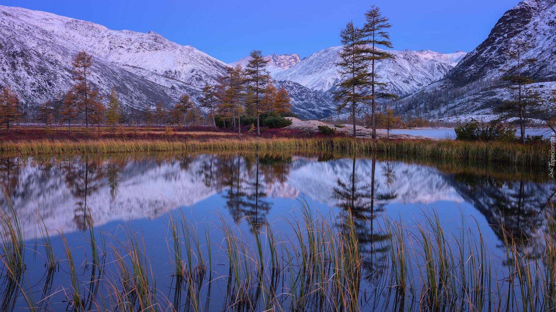Edytor tapety: Odbicie ośnieżonych gór w jeziorze Jack London