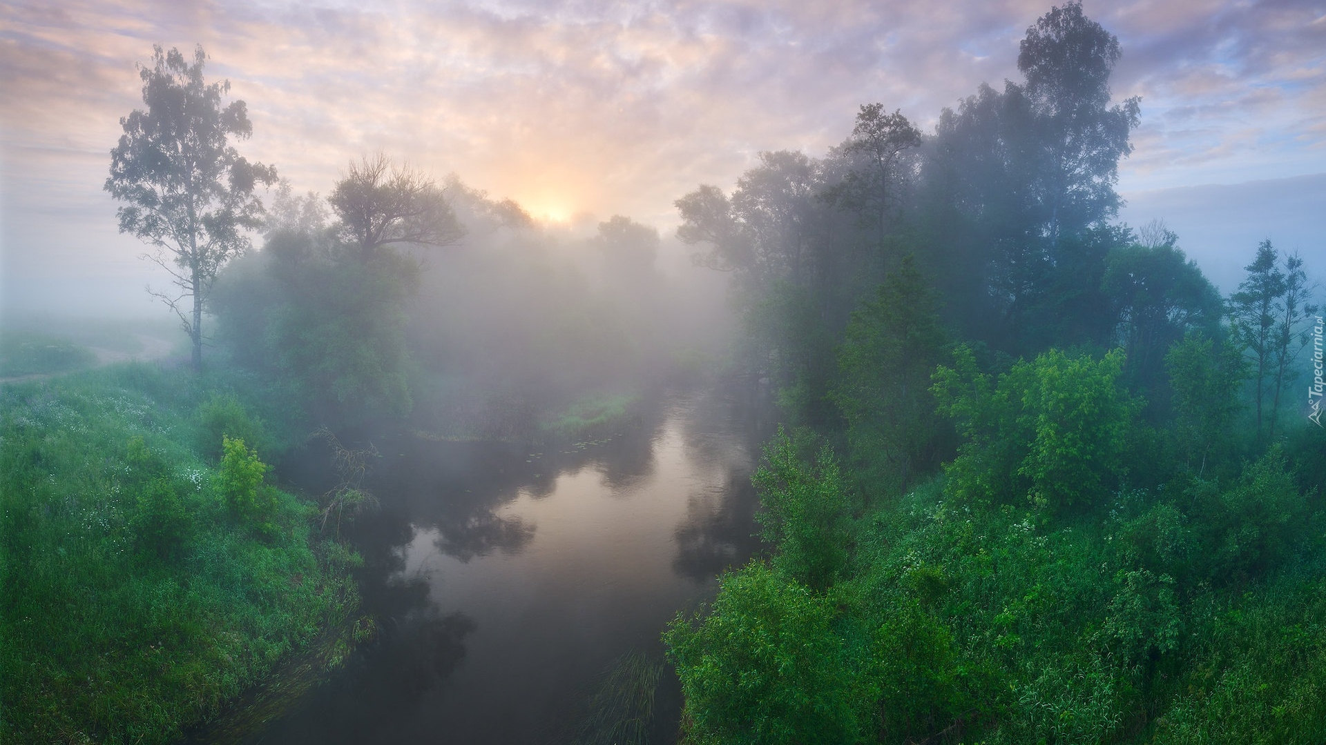 Edytor tapety: Poranna mgła nad drzewami i rzeką