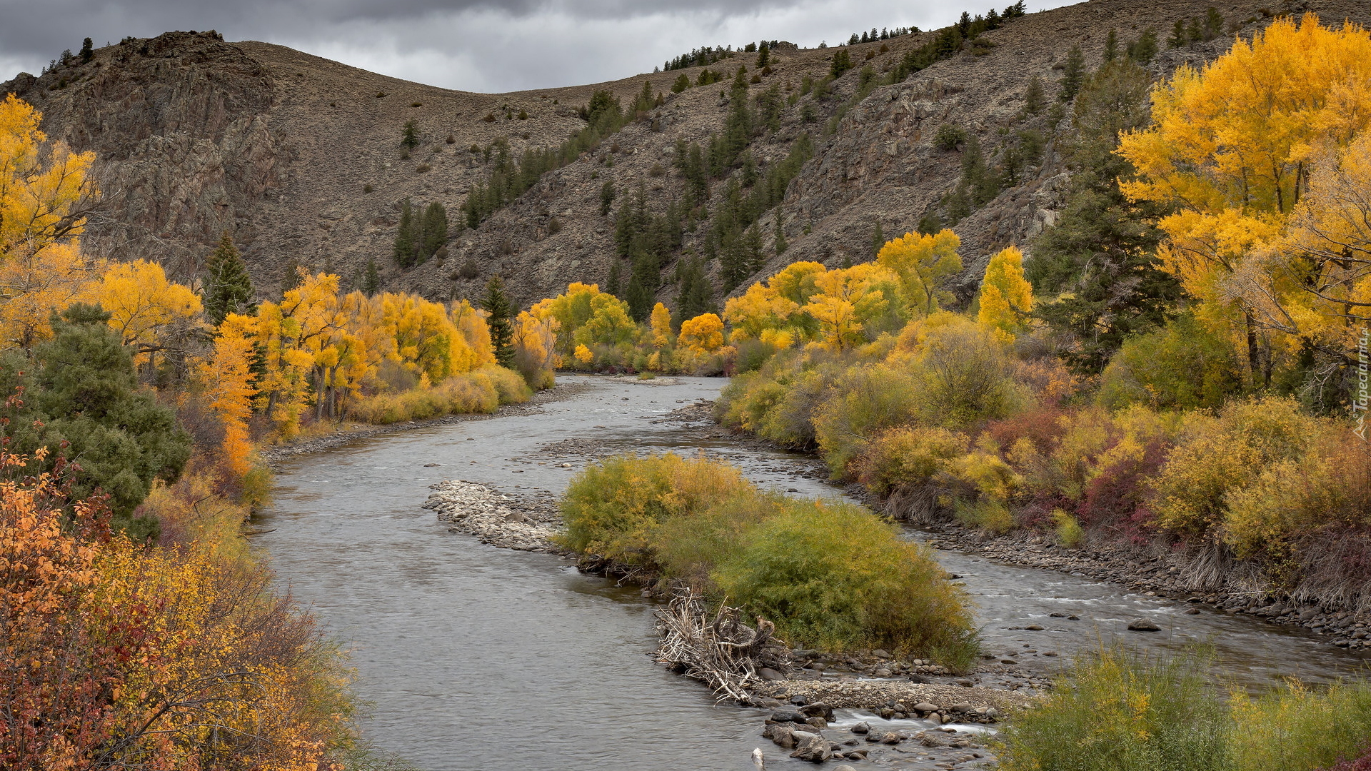 Edytor tapety: Pożółkłe drzewa nad rzeką Gunnison River w Kolorado