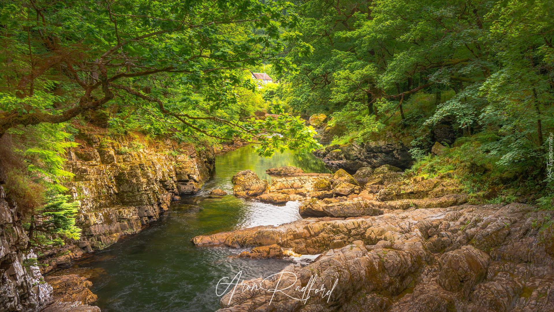 Edytor tapety: Rzeka pośród skał i drzew