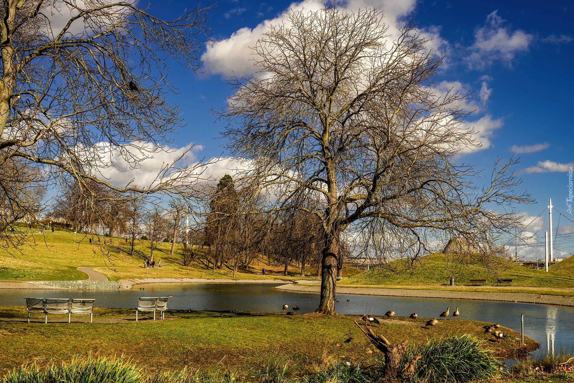 Edytor tapety: Kaczki pod drzewem nad stawem w parku