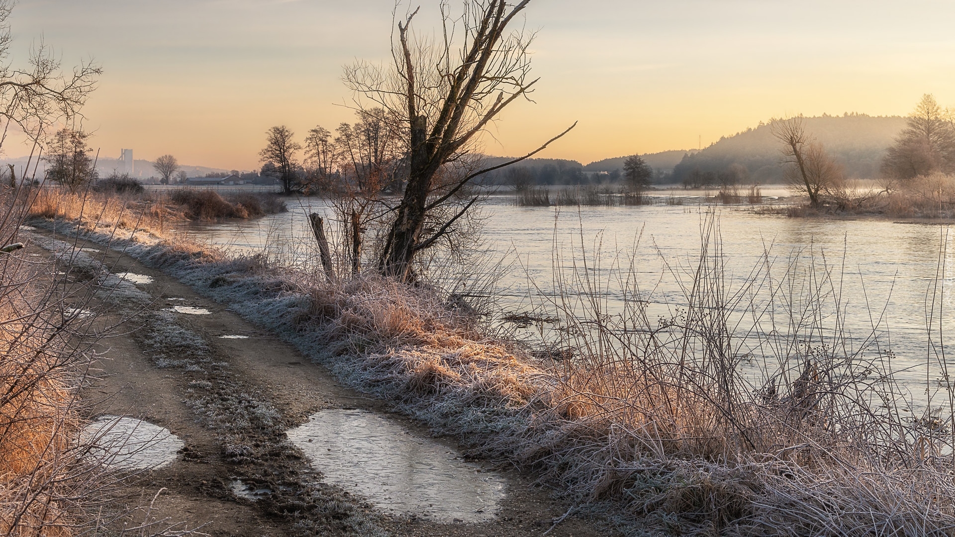 Edytor tapety: Drzewa i oszroniona trawa przy drodze nad rzeką