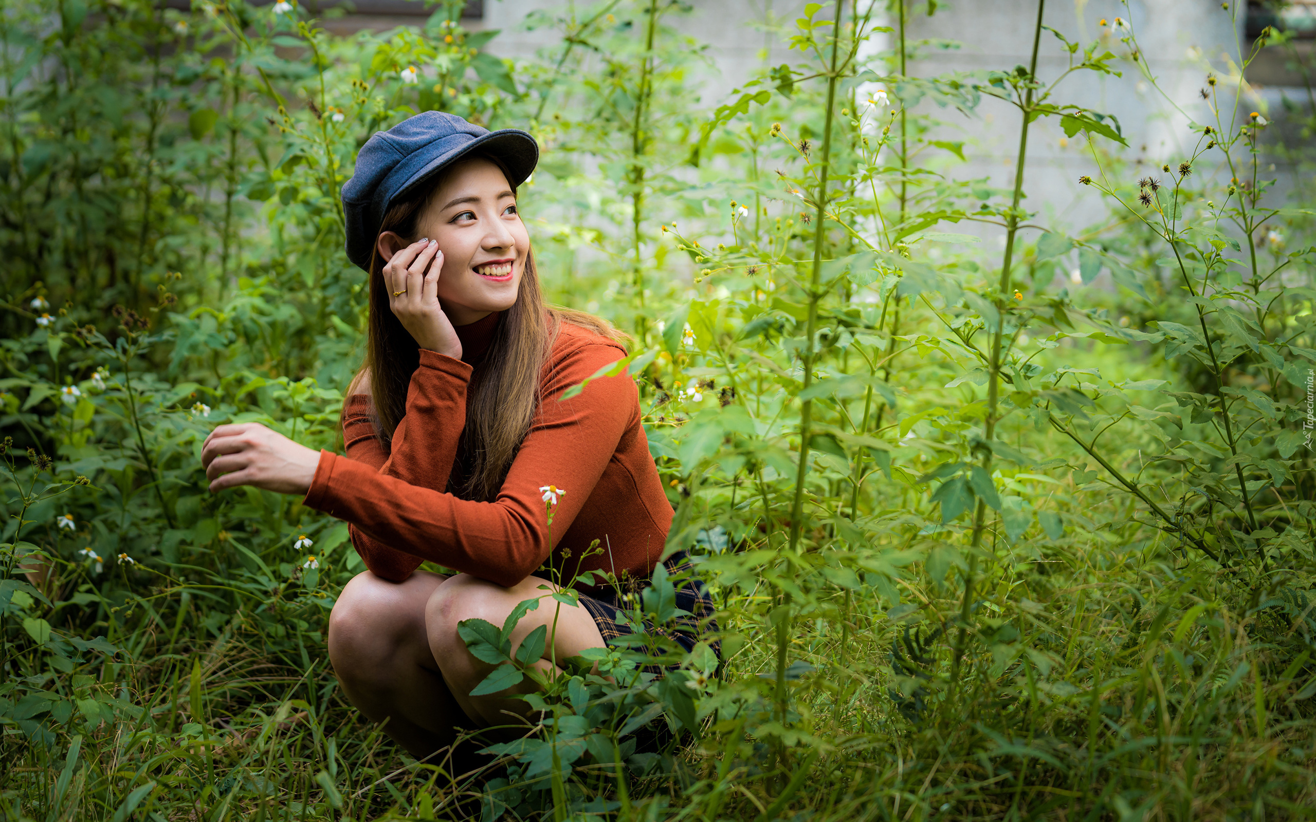 Edytor tapety: Uśmiechnięta kobieta w czapce wśród roślin