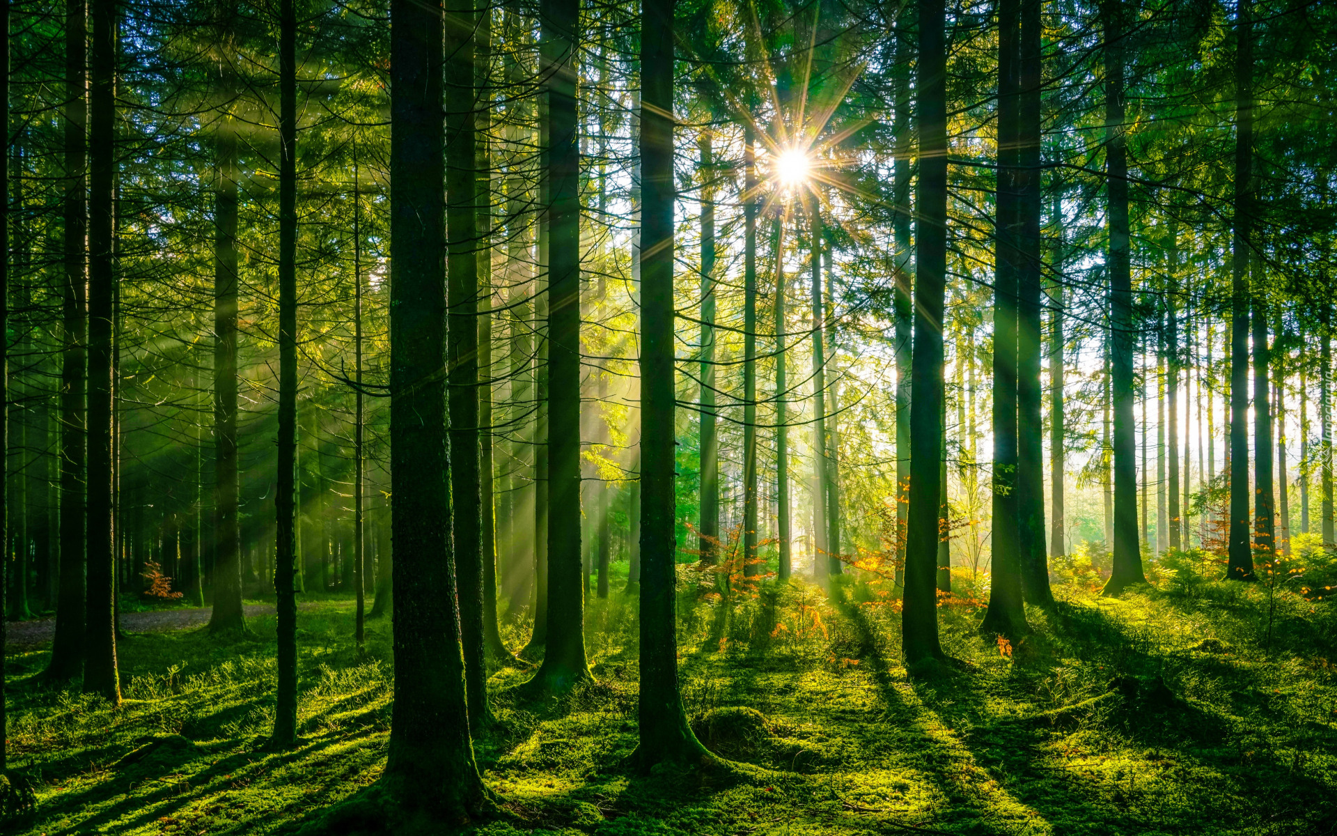Edytor tapety: Słoneczne promienie wśród drzew w zielonym lesie