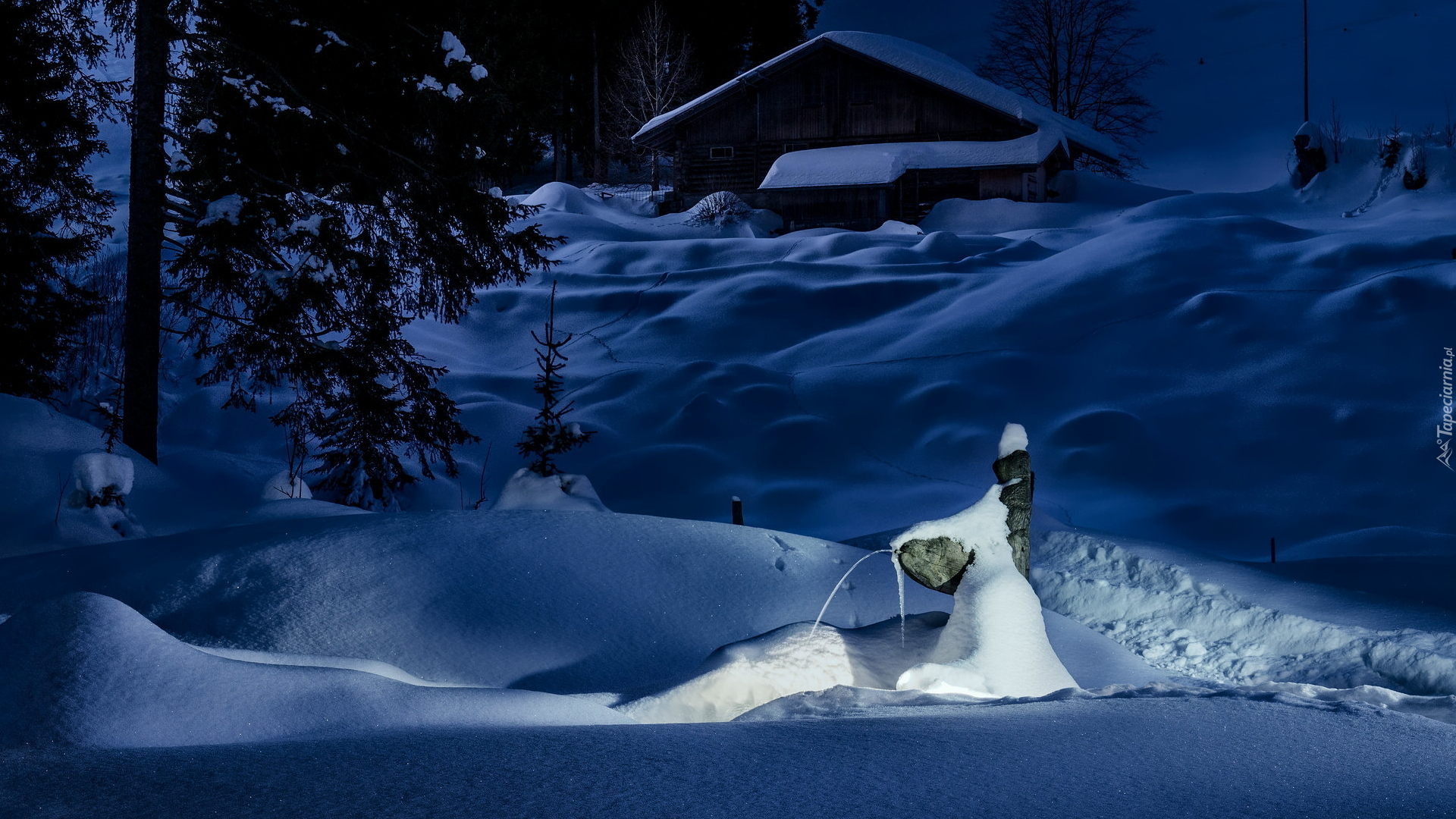 Edytor tapety: Zasypany śniegiem dom w lesie nocą