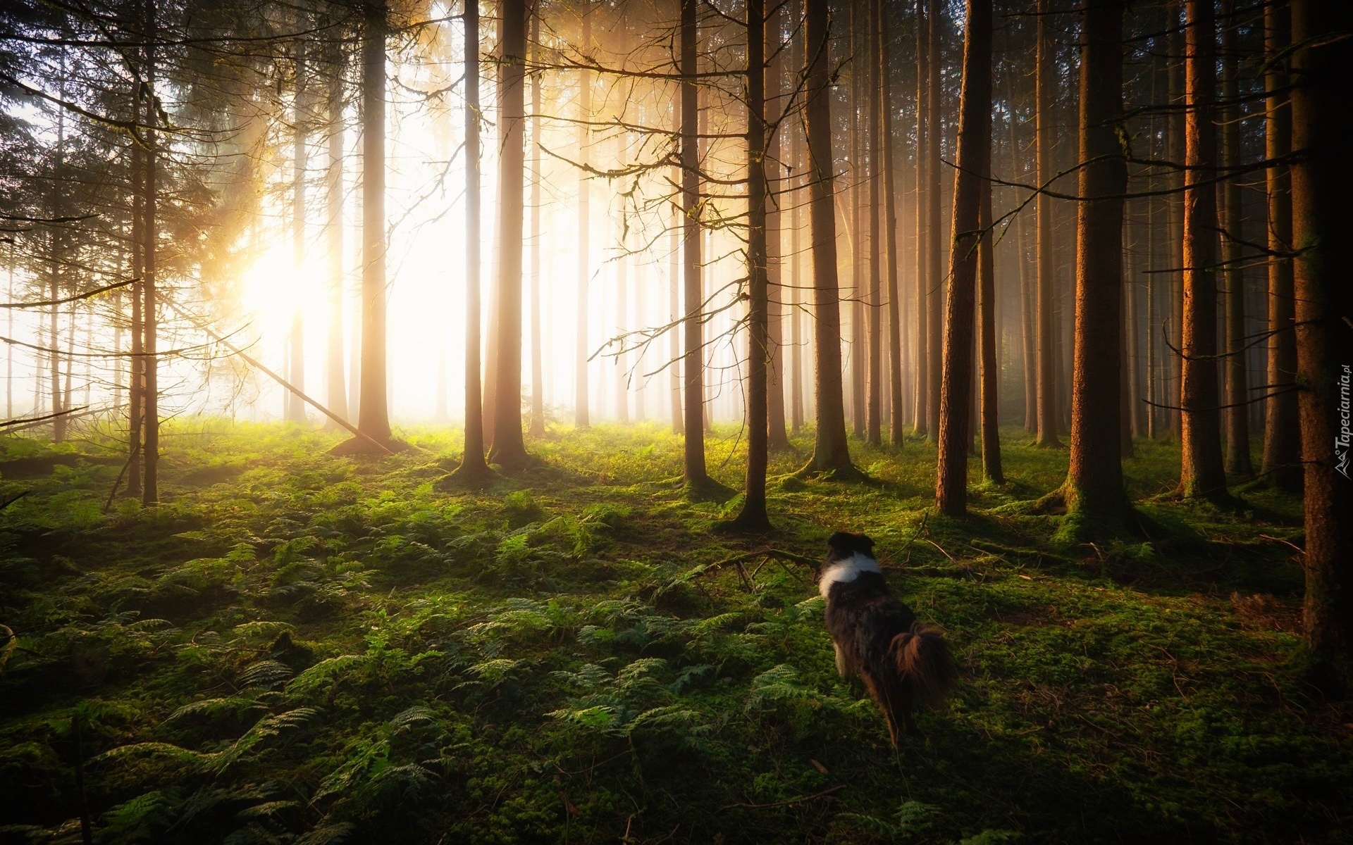Edytor tapety: Pies w rozświetlonym lesie