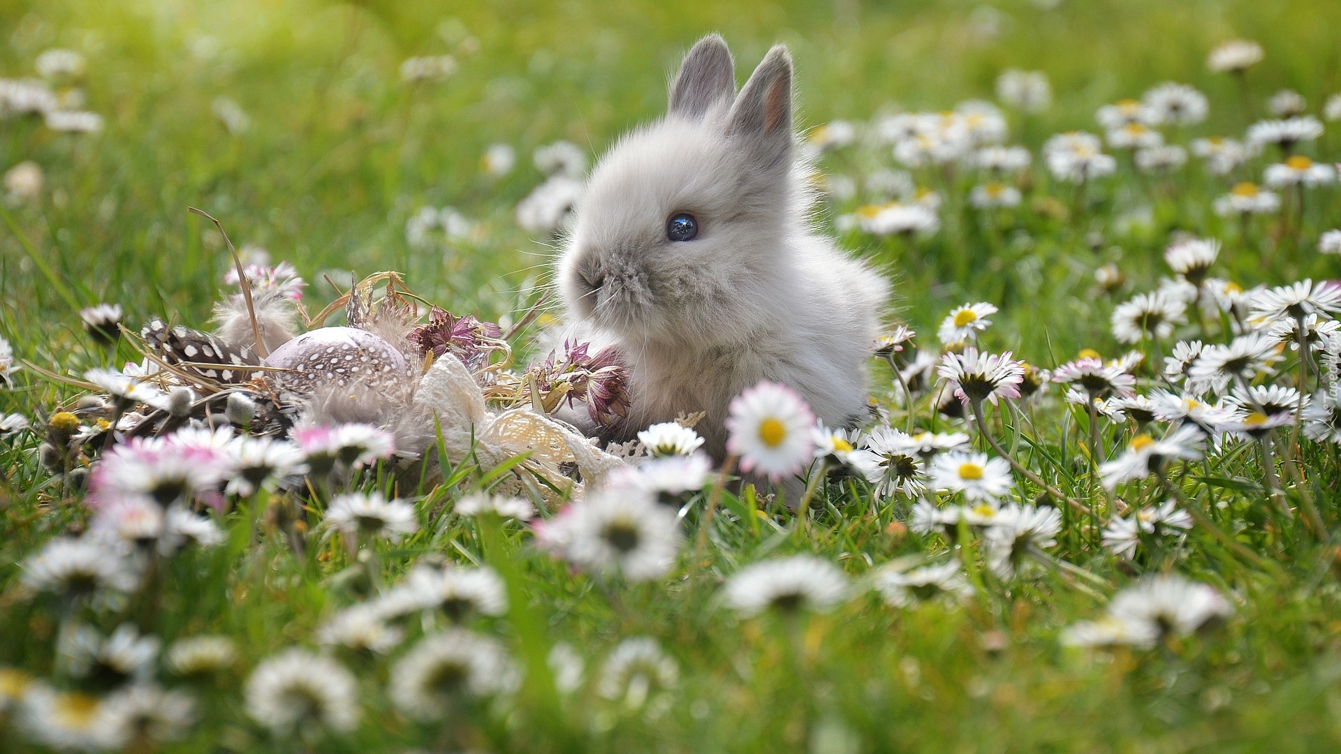Edytor tapety: Królik obok pisanki pośród stokrotek