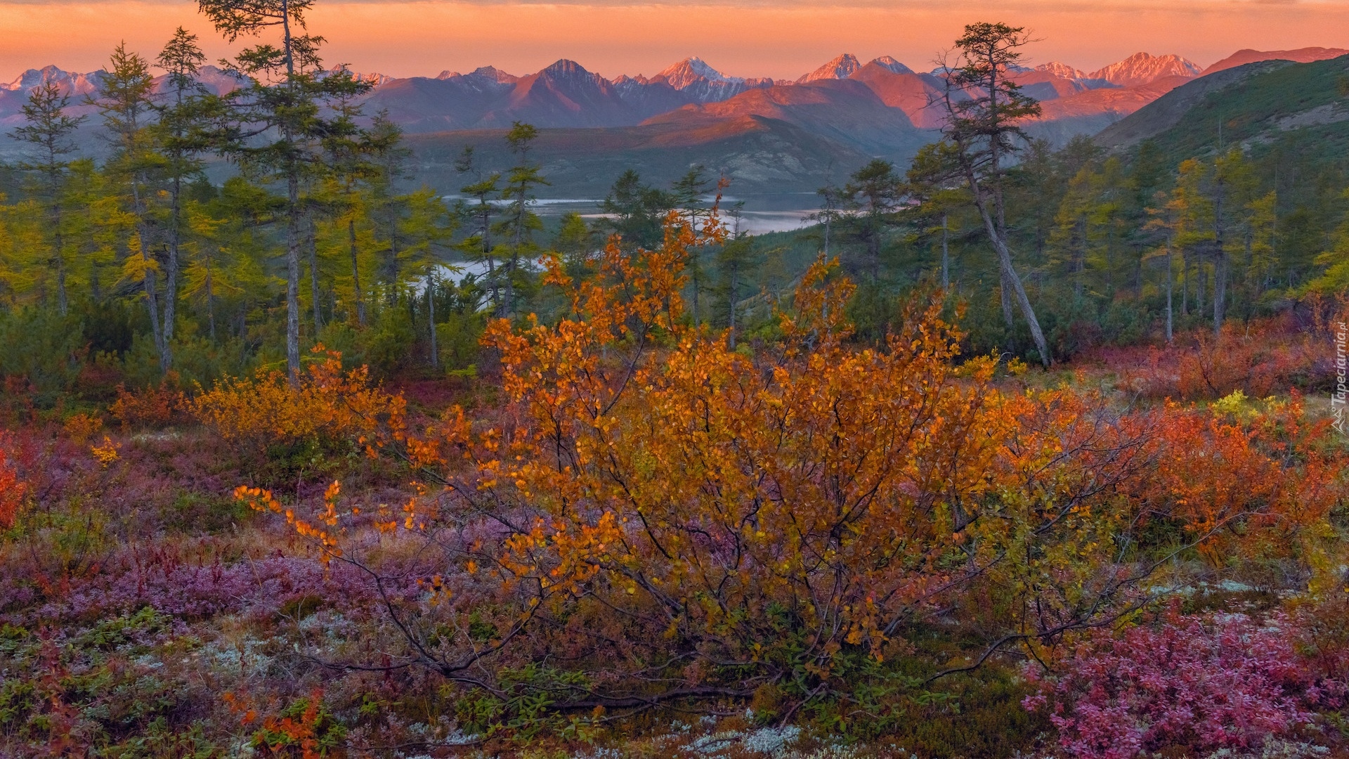 Edytor tapety: Jesienne krzewy i drzewa na tle Gór Kołymskich