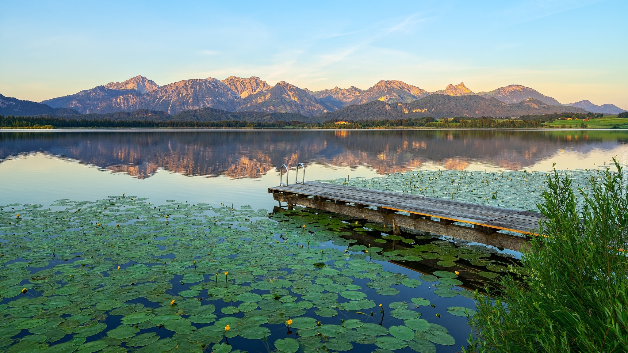 Edytor tapety: Lilie wodne obok pomostu na jeziorze Hopfensee