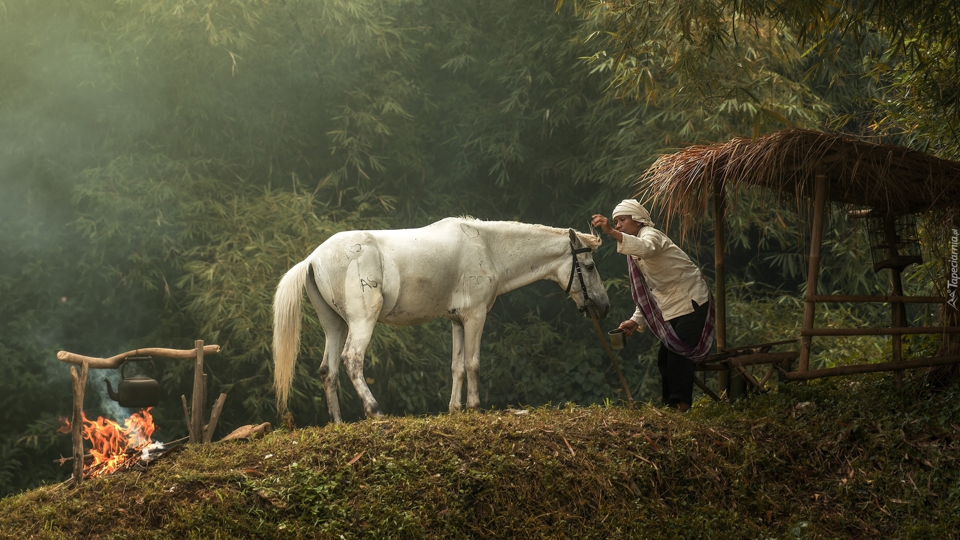 Edytor tapety: Kobieta z białym koniem przy ognisku
