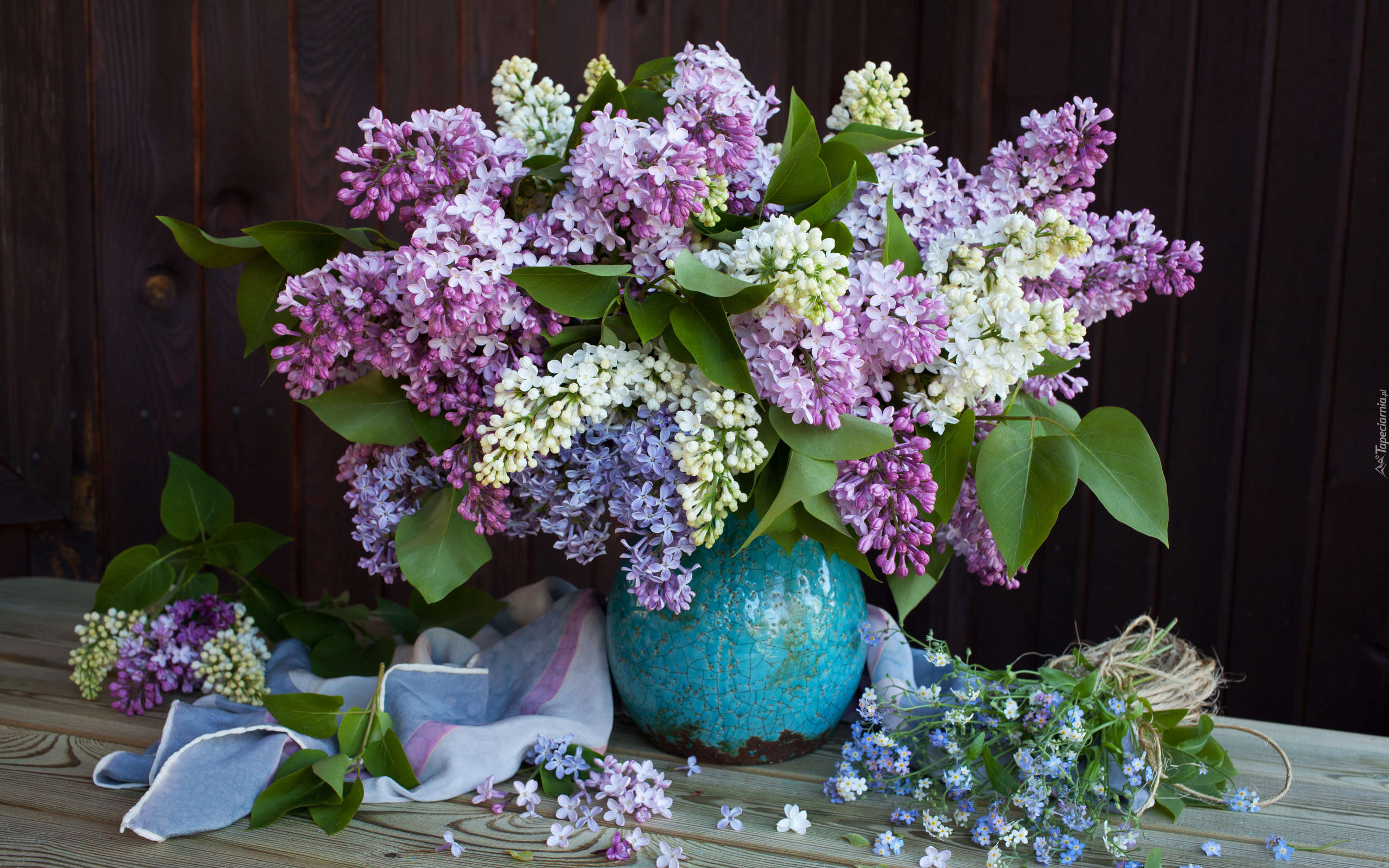 Edytor tapety: Kolorowy bez w niebieskim wazonie