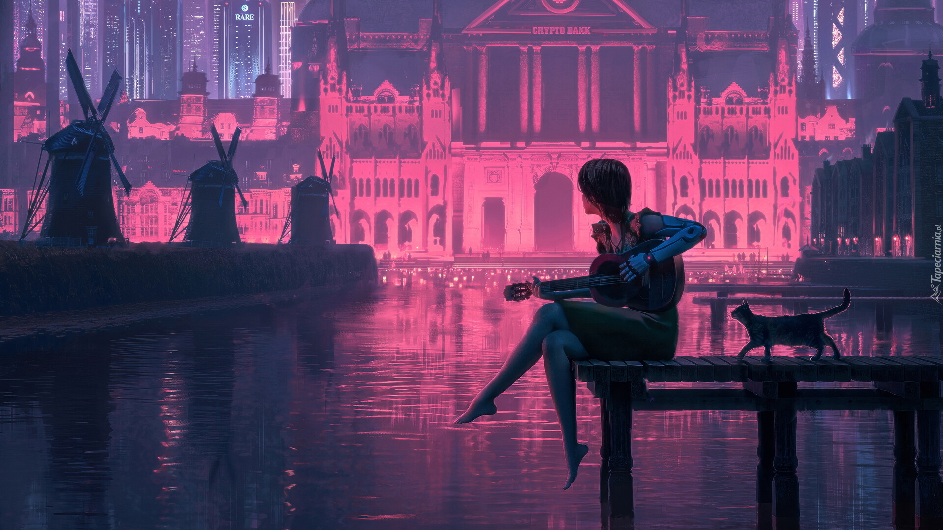 Edytor tapety: Dziewczyna z gitarą i kotem na pomoście