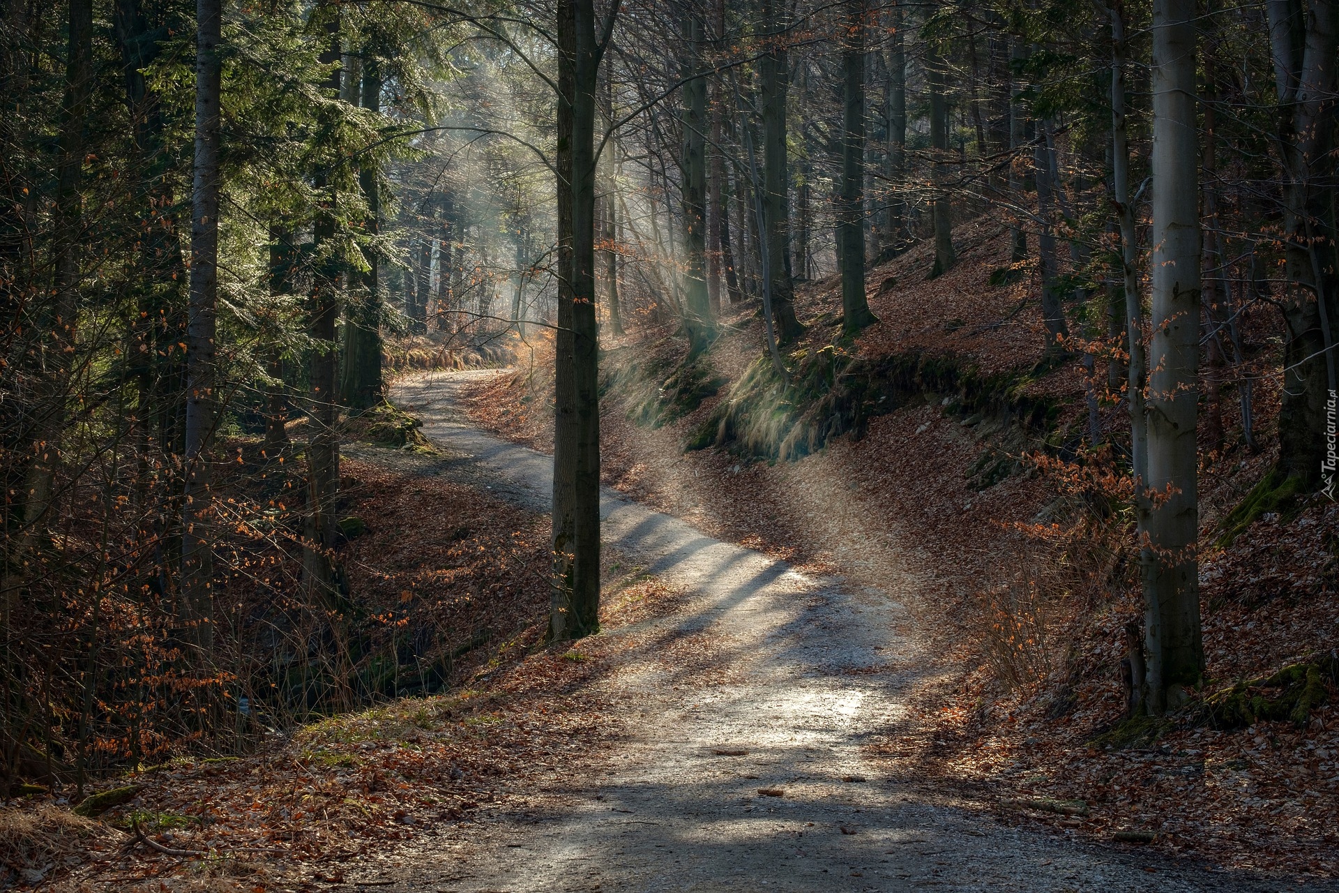 Edytor tapety: Rozświetlona ścieżka w jesiennym lesie
