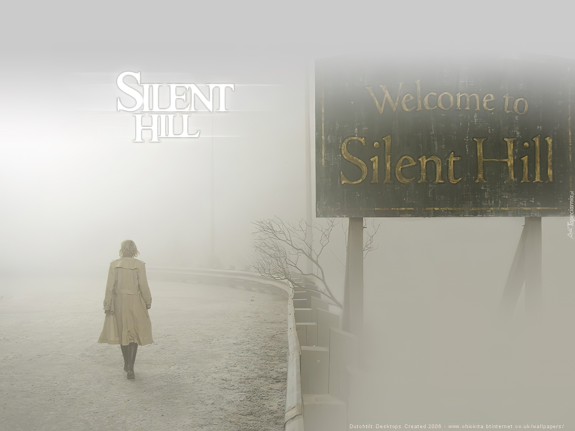 Edytor tapety: Silent Hill, mgła, droga, szyld, kobieta