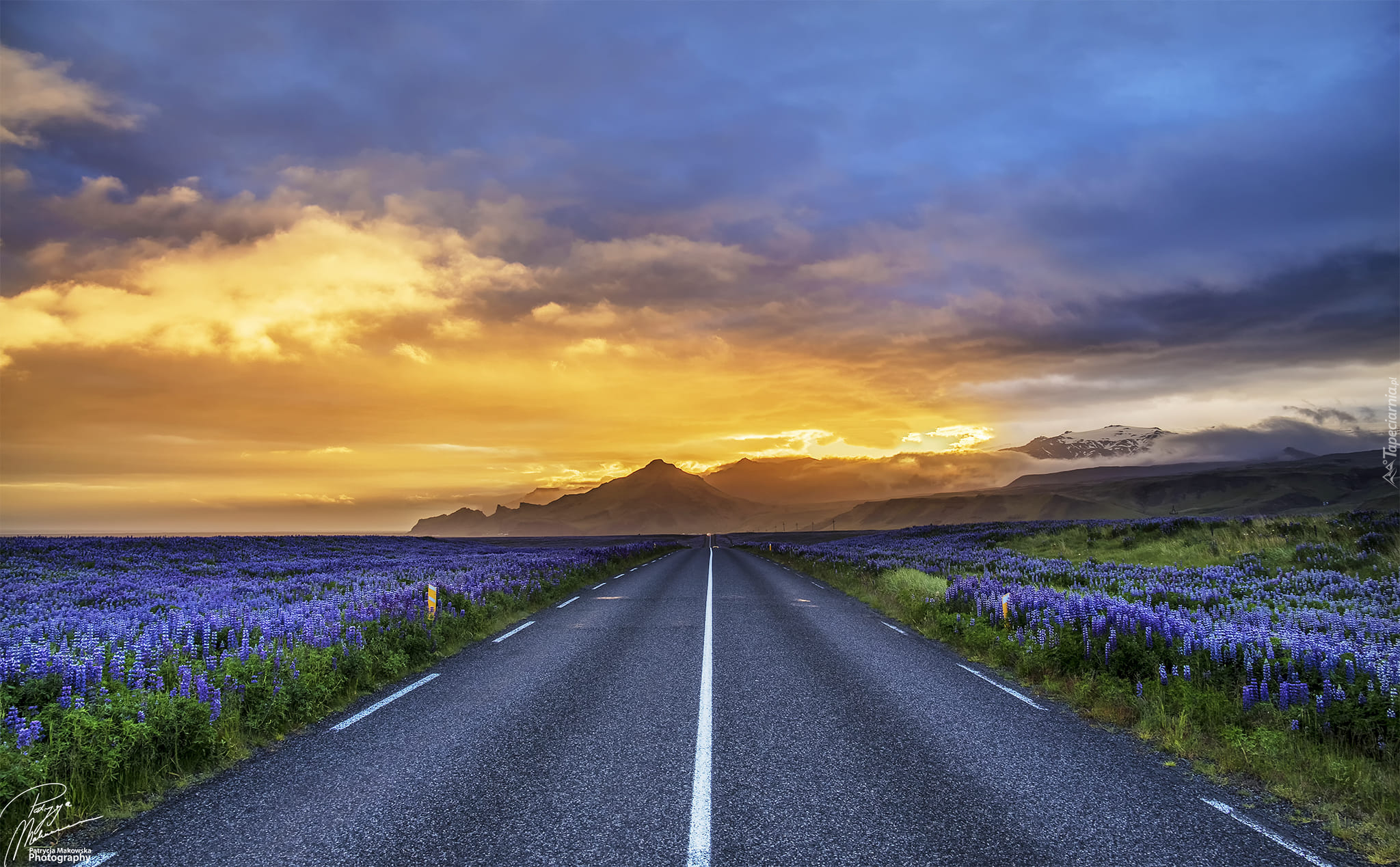 Edytor tapety: Łubiny przy asfaltowej drodze w stronę gór