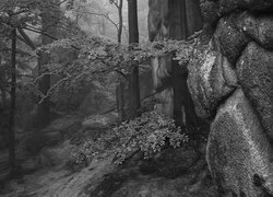Edytor tapety: Drzewa z zielonymi liśćmi obok skały