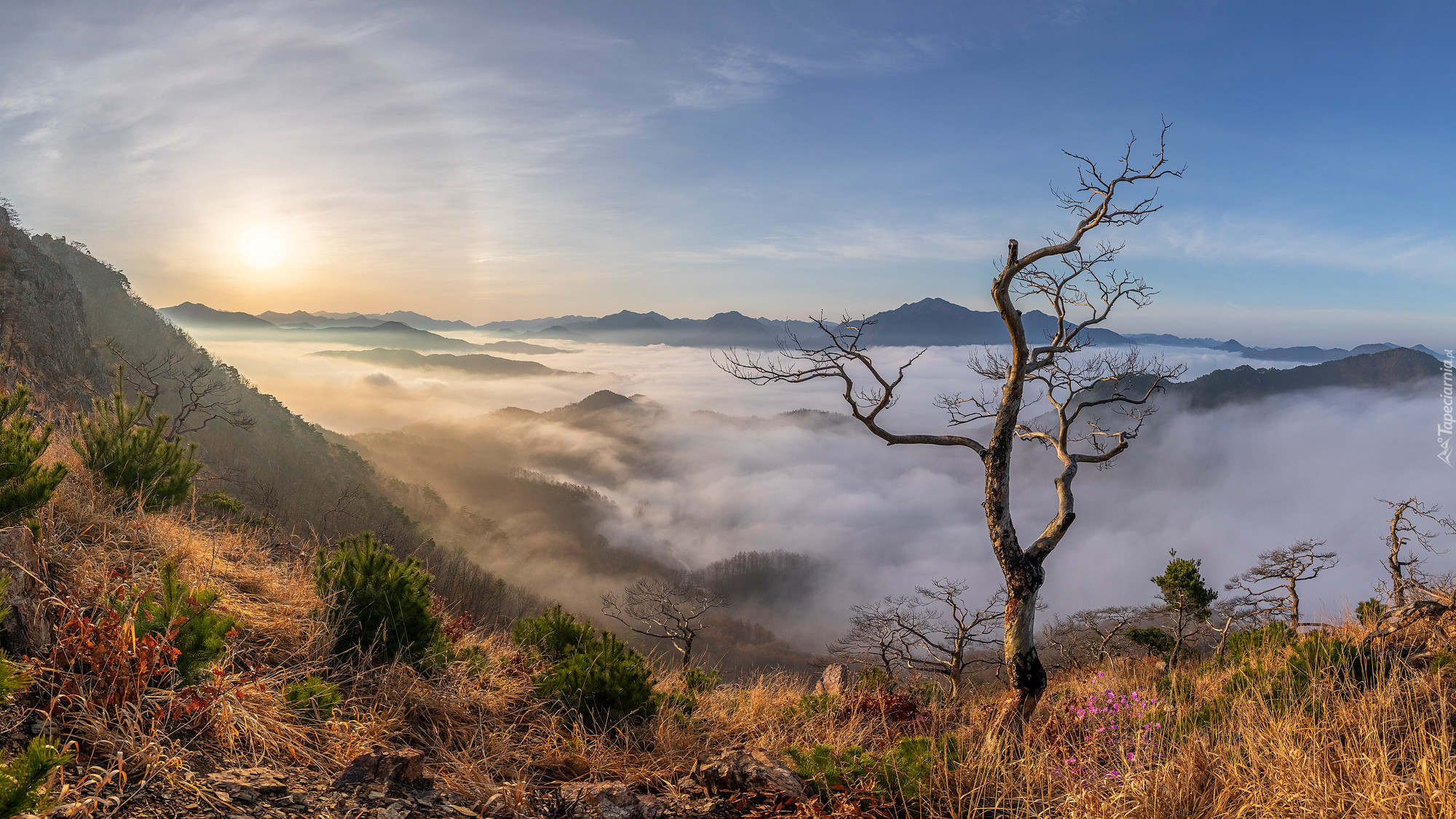 Edytor tapety: Bezlistne drzewa i zamglone góry