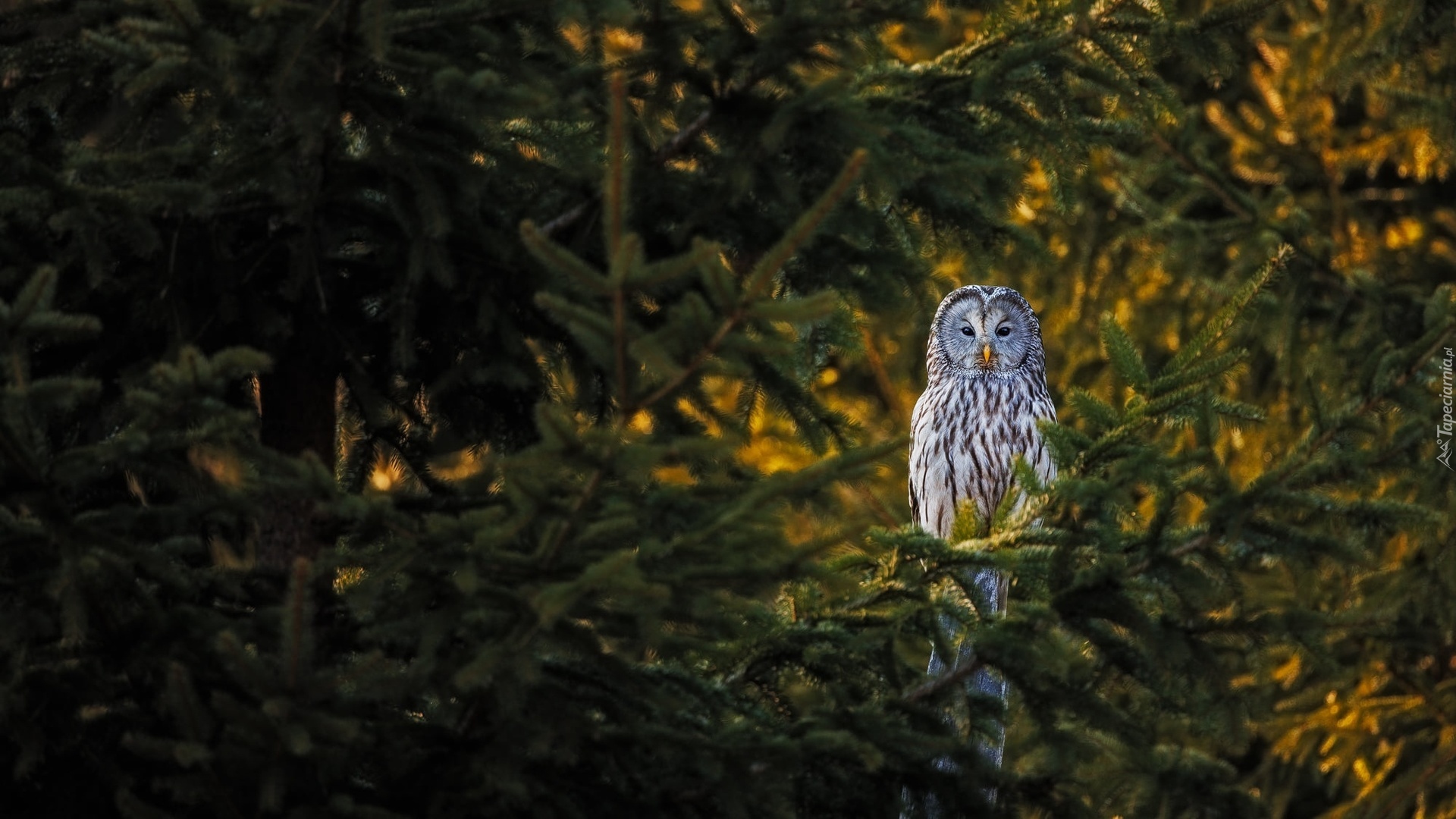 Edytor tapety: Puszczyk na gałązce pośród drzew