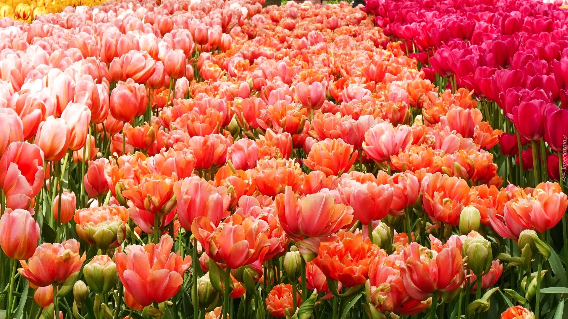Edytor tapety: Kwitnące kolorowe tulipany na polu