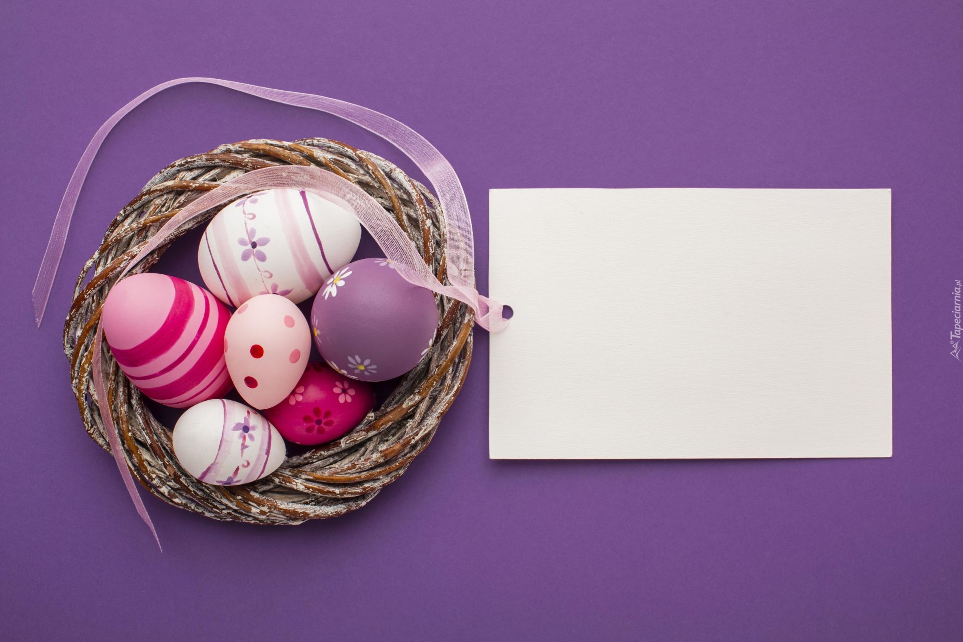 Edytor tapety: Pisanki w gniazdku obok kartki na fioletowym tle