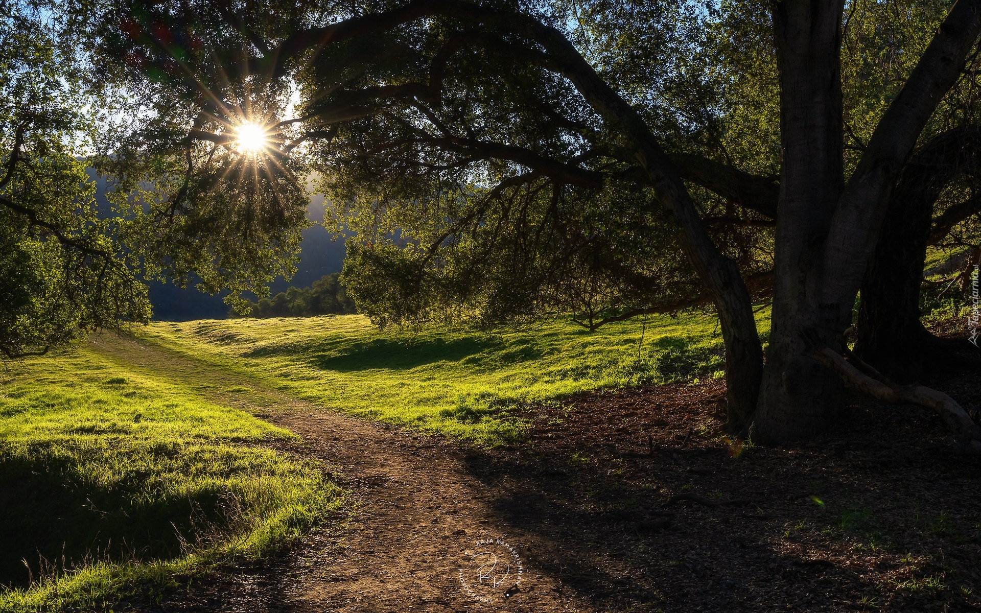 Edytor tapety: Rozłożyste drzewo przy drodze w promieniach słońca