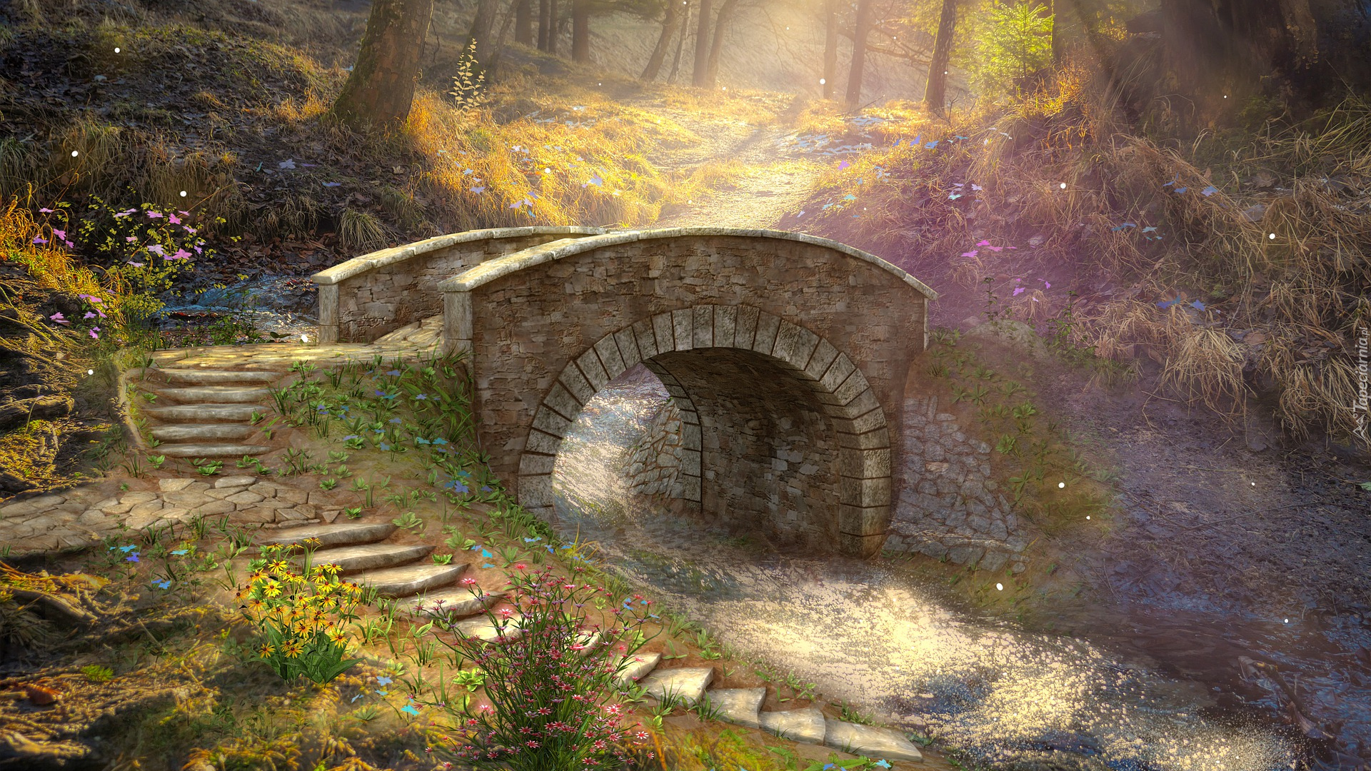 Edytor tapety: Schody do kamiennego mostku nad rzeką w lesie