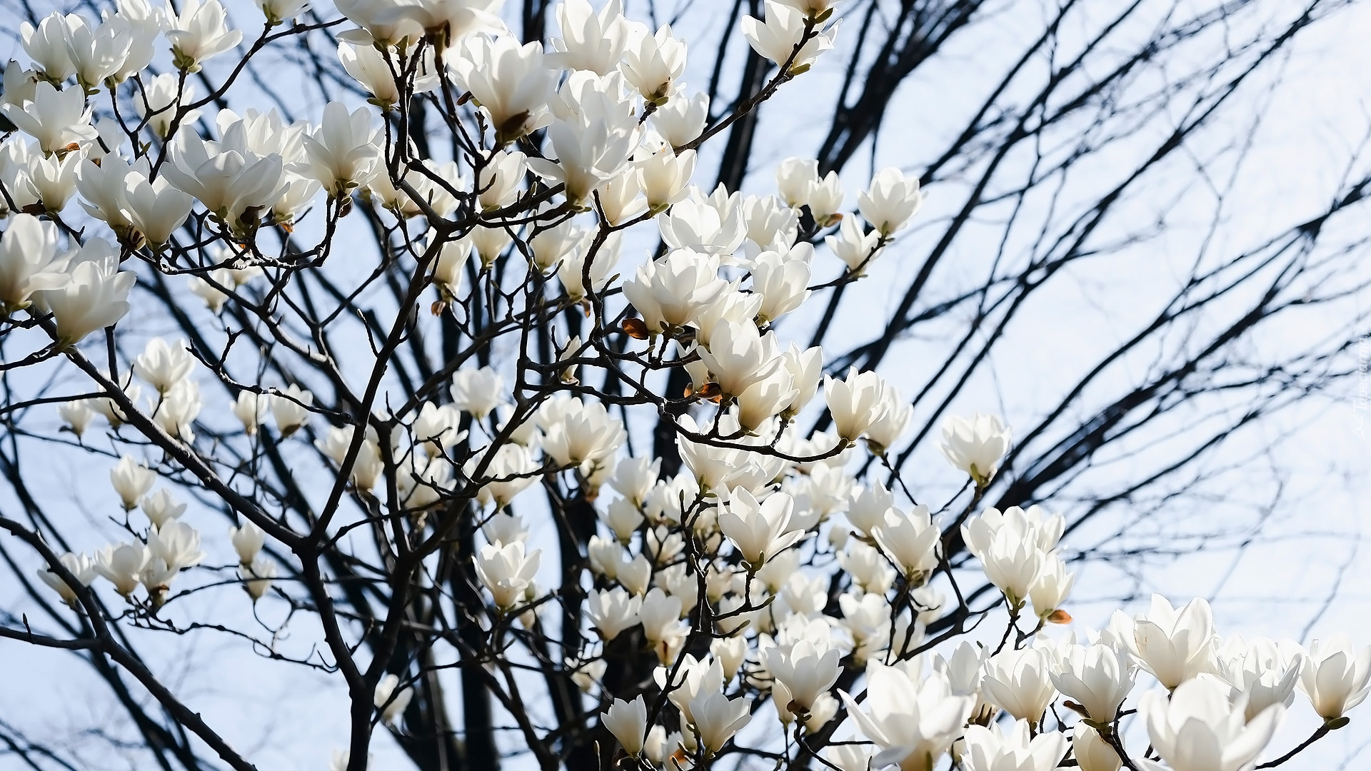 Edytor tapety: Kwitnące białe magnolie na gałązkach