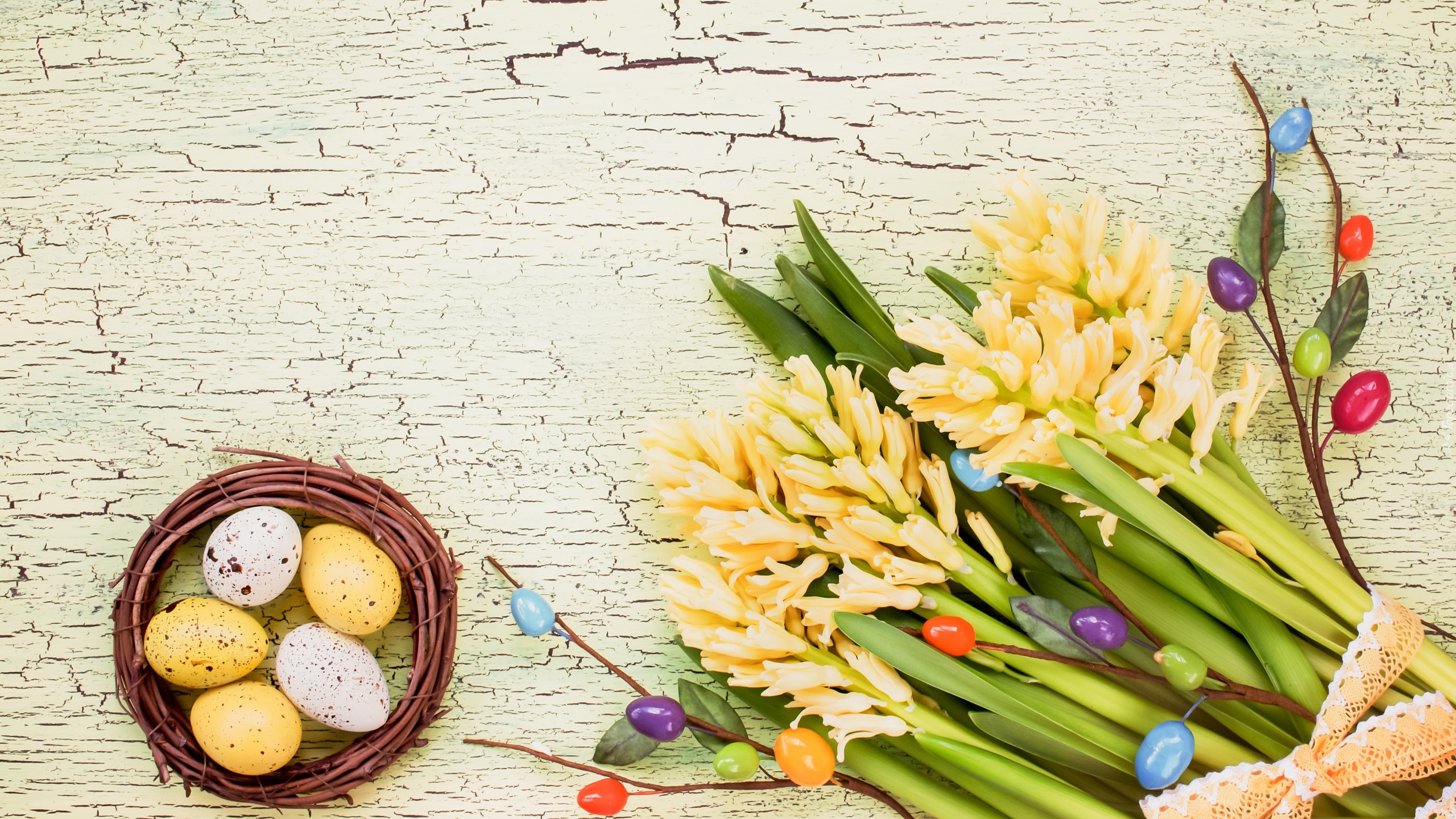Edytor tapety: Pisanki obok hiacyntów na popękanym drewnie