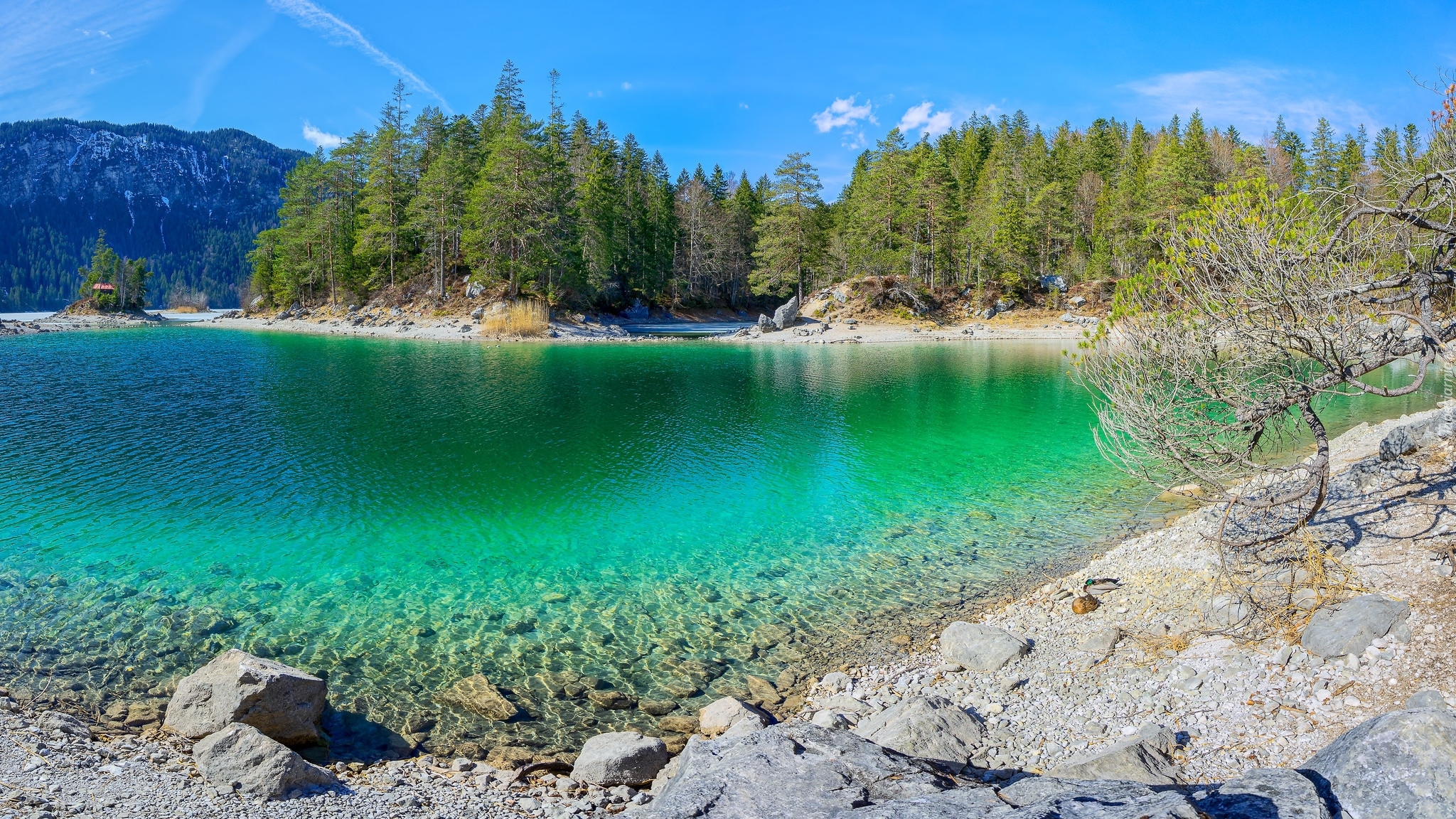 Edytor tapety: Drzewa i góry nad jeziorem Eibsee w Bawarii