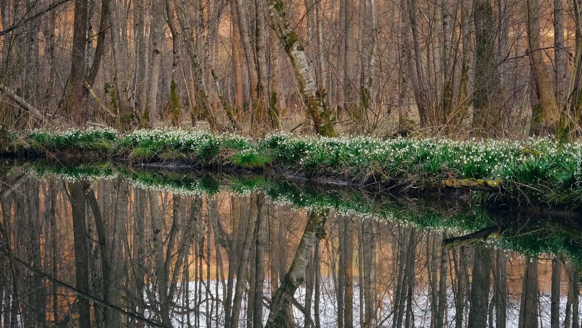 Edytor tapety: Śnieżyce w lesie na brzegu rzeki