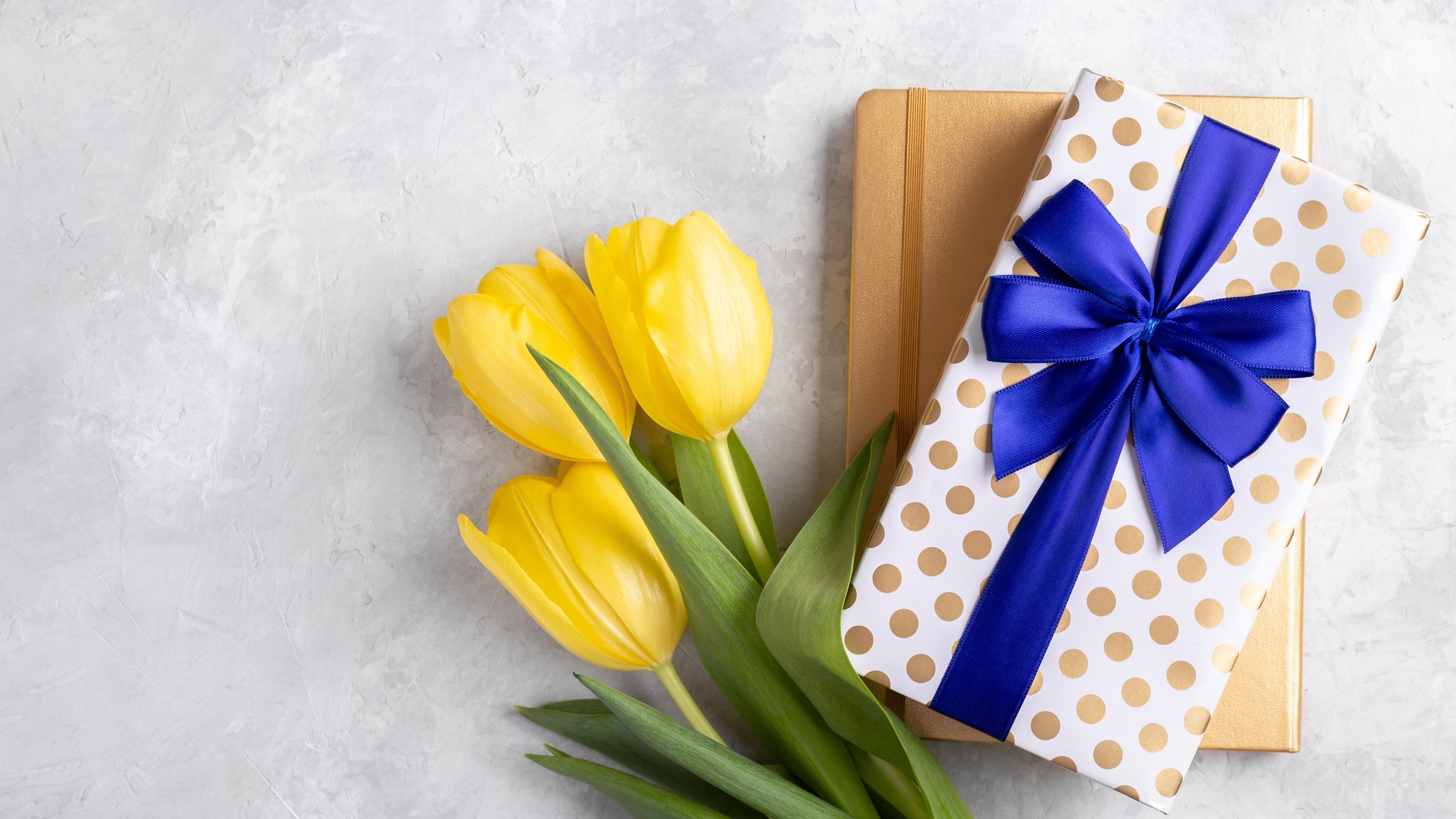 Edytor tapety: Żółte tulipany obok notesu i prezentu