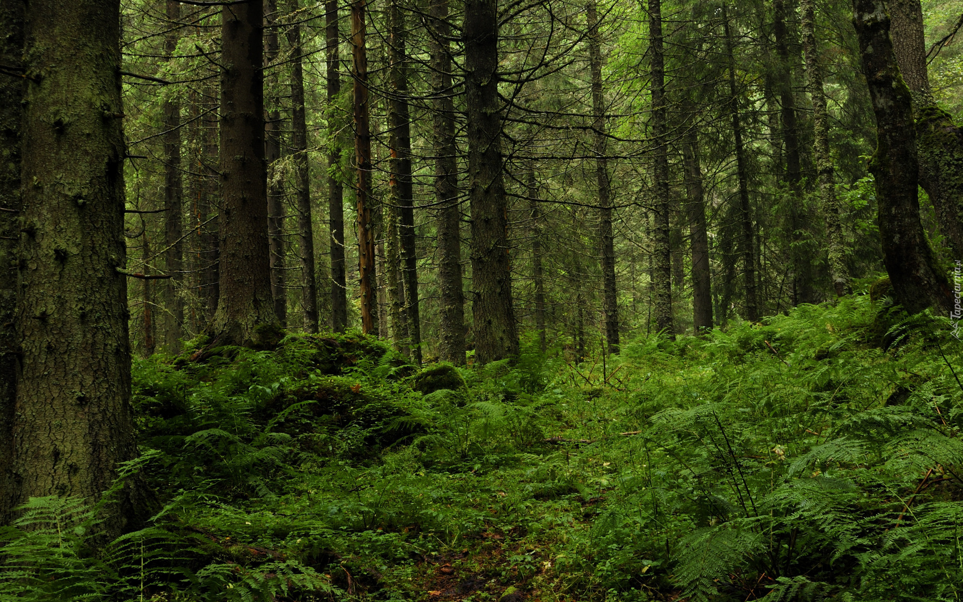 Edytor tapety: Drzewa i paprocie w zielonym lesie