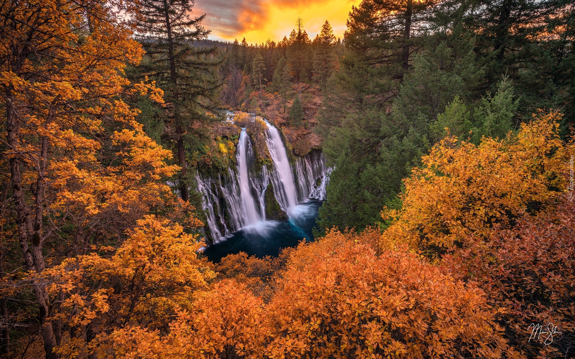 Edytor tapety: Widok zza pożółkłych drzew na wodospad Burney Falls
