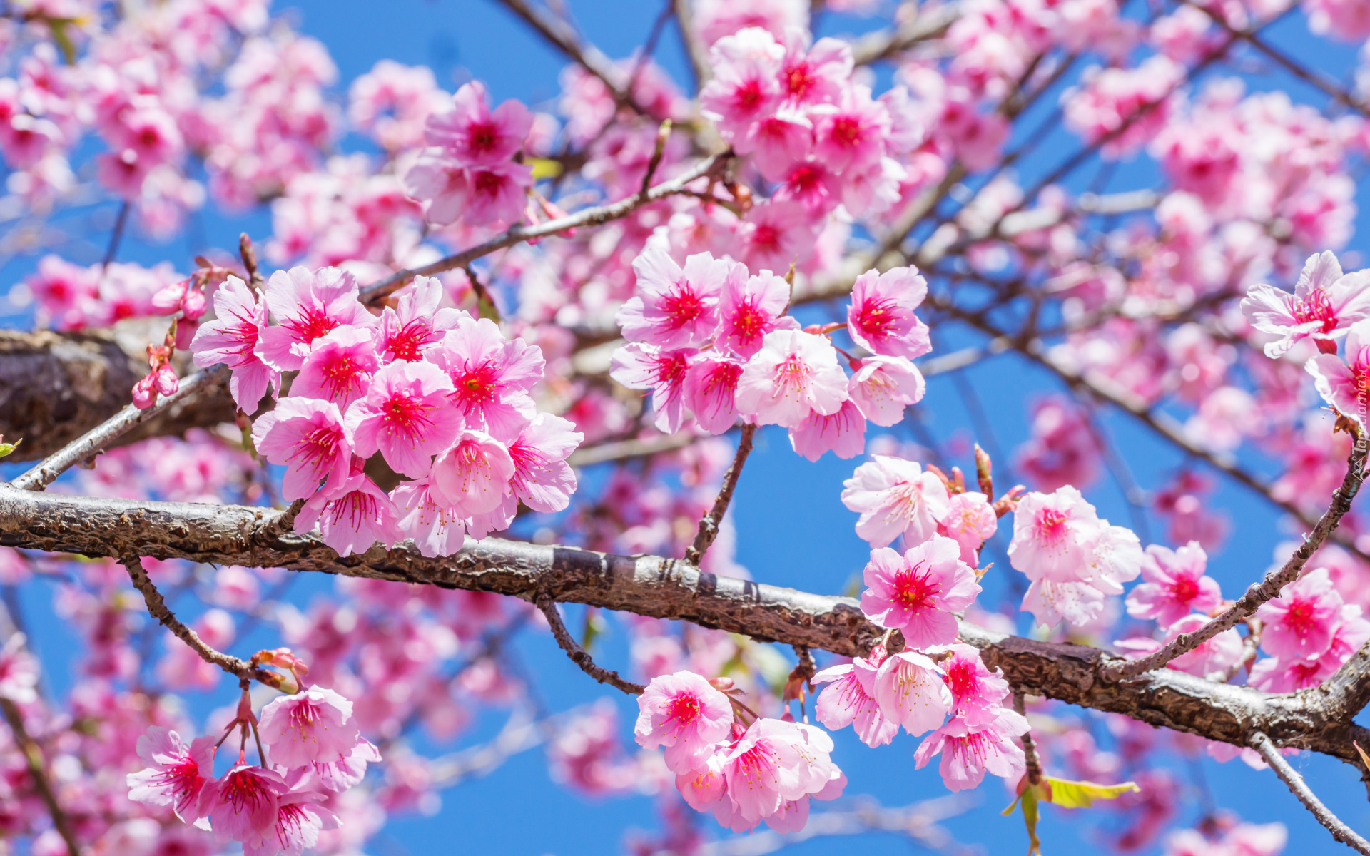 Edytor tapety: Kwitnące kwiaty wiśni na tle niebieskiego nieba