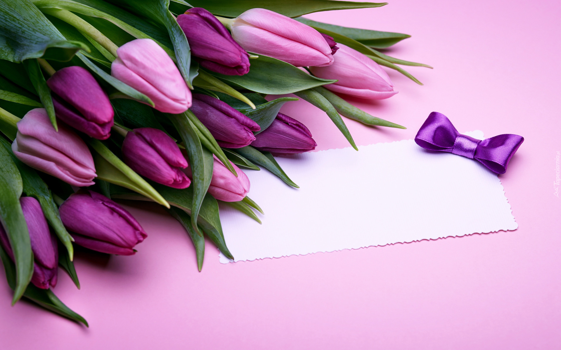 Edytor tapety: Fioletowe tulipany obok kartki i kokardki