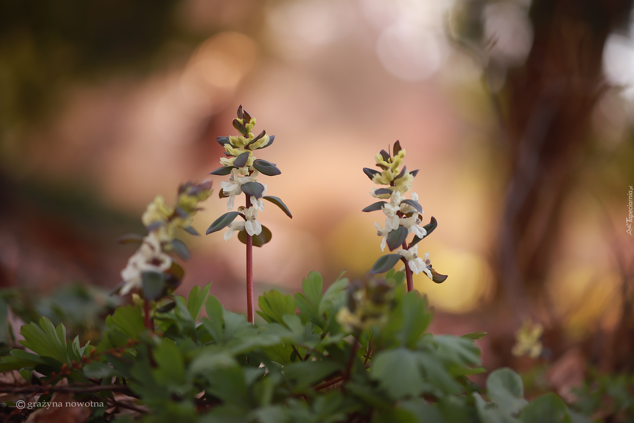Edytor tapety: Białe leśne kwiaty na rozświetlonym tle