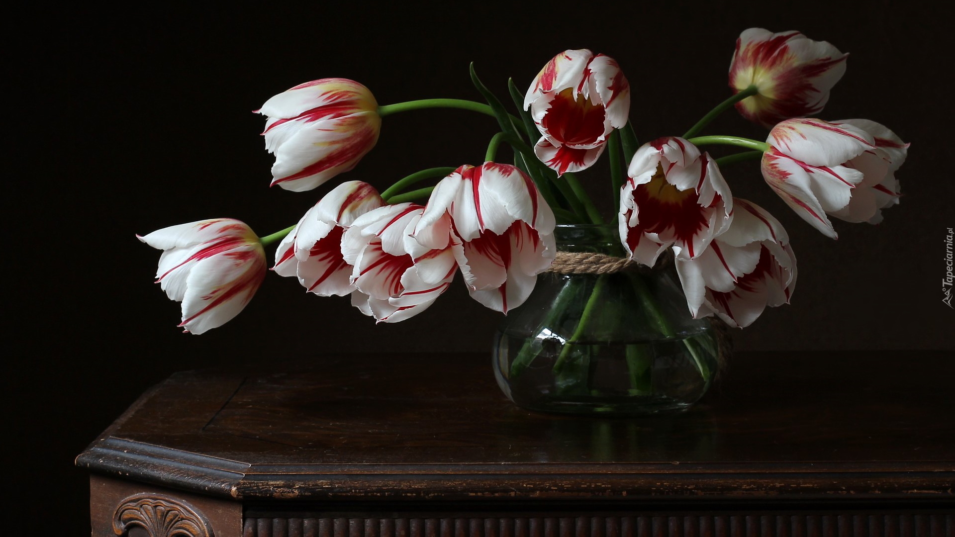 Edytor tapety: Rozkwitnięte biało-czerwone tulipany w wazonie