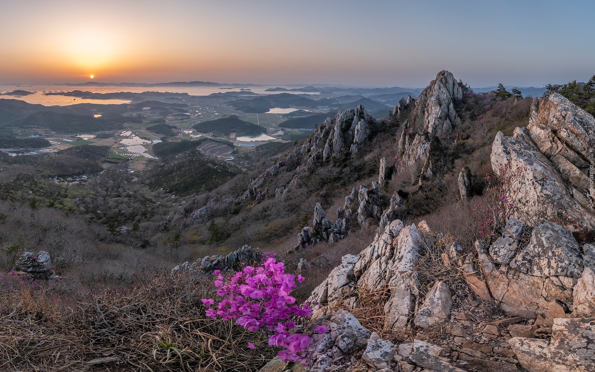 Edytor tapety: Widok znad gór i skał na wschodzące słońce