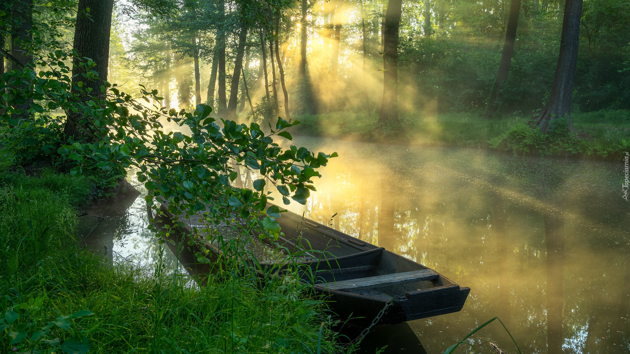 Edytor tapety: Łódka na leśnej rzece