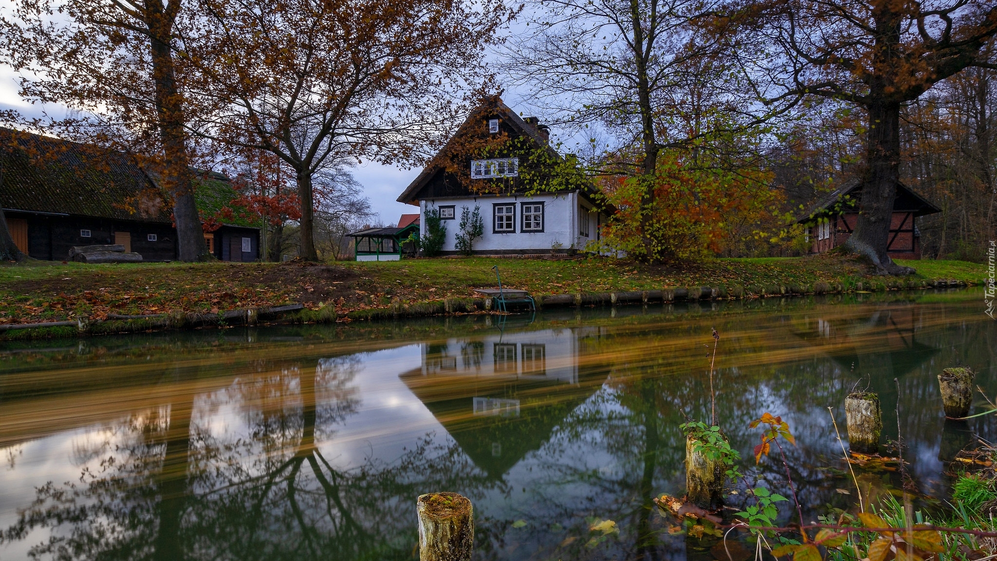Edytor tapety: Odbicie domu i drzew w stawie