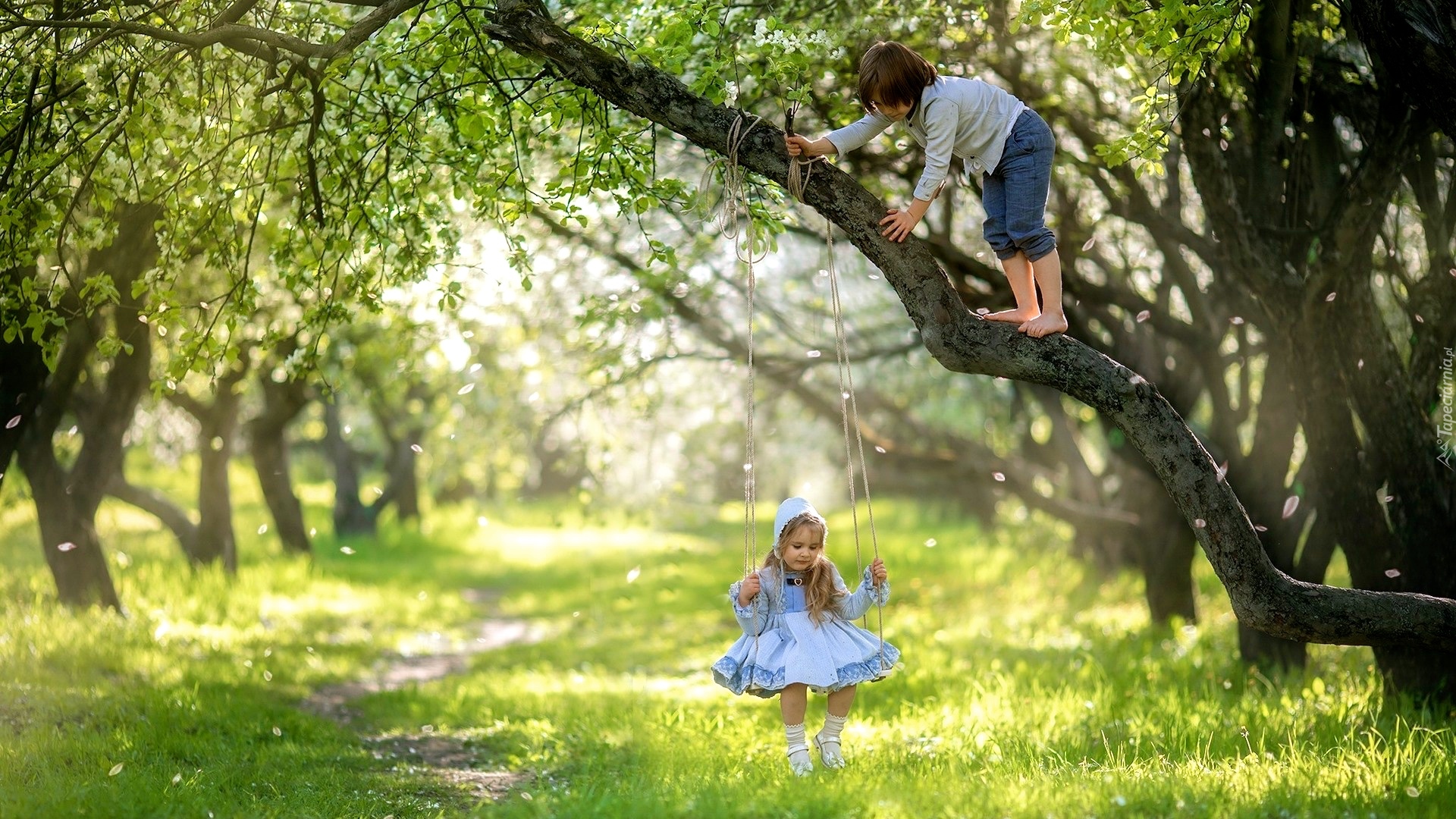 Edytor tapety: Chłopiec na drzewie i dziewczynka na huśtawce